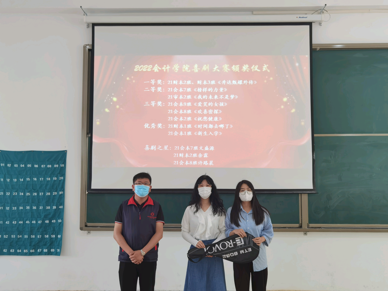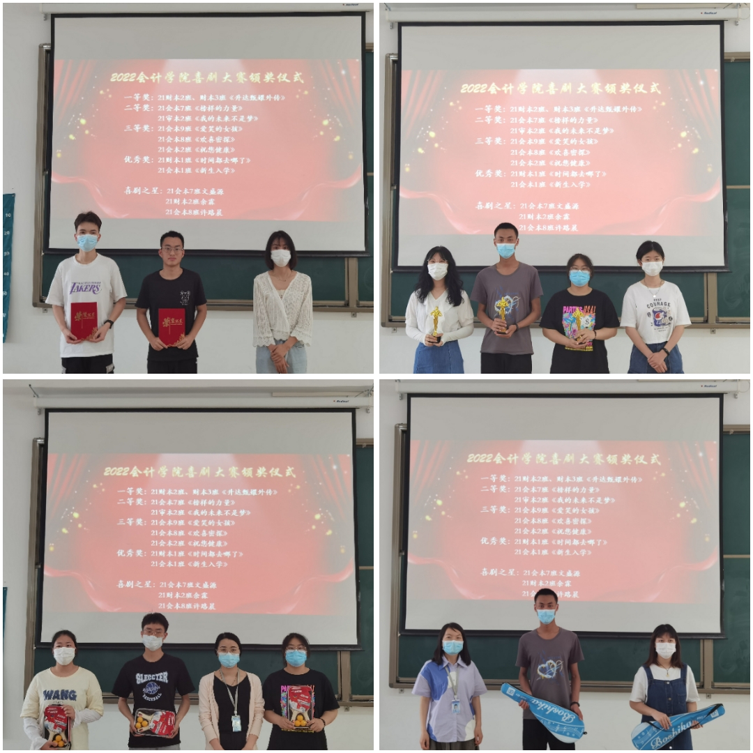 经过激烈的角逐之后,最终进入激动人心的颁奖环节。首先,由第27届团委副书记赵琼为21财本一班的《时间都去哪儿了》,21会本一班的《新生入学》颁发优秀奖;由学生会主席何媛为21会本7班文盛源,21财本2班余霖,21会本8班许路晨颁发个人奖喜剧之星;由太阳网集团tcy8722双创工作专员、辅导员胡淑娟老师为21会本九班的《爱笑的女孩》,21会本八班的《欢喜密探》,21会本二班的《祝您健康》颁发三等奖;由太阳网集团tcy8722心理健康工作专员、辅导员支园园老师为21审本二班的《我的未来不是梦》,21会本七班的《榜样的力量》颁发二等奖;最后,由行政秘书兼团委书记陈刚老师为21财本二班和三班的《升达甄嬛外传》颁发一等奖。至此,本次大赛圆满结束。