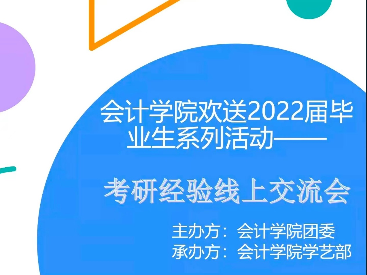 本次考研经验线上交流会在主持人刘铠铭的简单介绍下拉开帷幕。首先是程龙向大家分享了自己的考研成绩,并向同学们提供了学习技巧;接着崔启航对个人和学校进行了介绍,并提出了数学和英语的学习方法;之后段惠惠对专研进行了分析提出学习规划的重要性,并分享了考研过程中备考的学习书籍以及学习网站;贾雅琳分享了考研经历,对初试和复试的过程进行了介绍;邱林洲和吴雪盈讲述了考研的初心和决心以及心态的调整;随后朱奕翰和张娜介绍了对学校的选择以及备考的相关软件,同时建议大家选择一个研友。最后在主持人刘铠铭的总结下此次考研经验线上交流会议圆满结束。