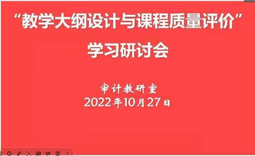 为促进专任教师做好面向产出的课程教学改革创新,提高教育教学质量和人才培养质量,审计教研室10月27日组织教师参加了一场关于“教学大纲设计与课程质量评价”的线上研讨会,会议由审计教研室主任王瑞云老师主持。