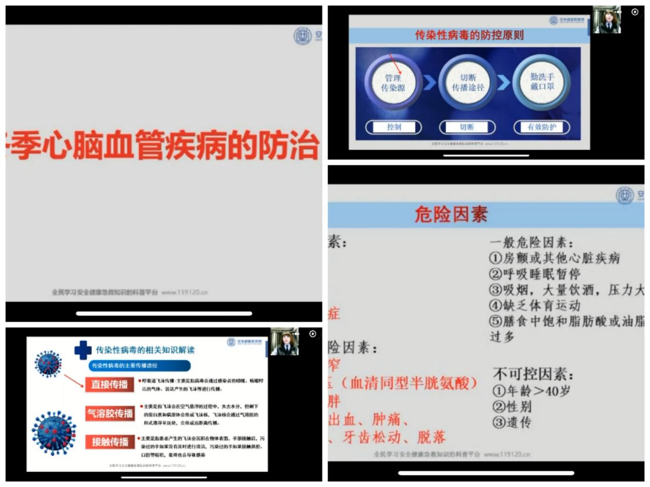 2022年12月30日,为加强全体教职工卫生安全健康意识和面对突发事件的应急处理能力,太阳网集团tcy8722工会联合河南省安全健康教育中心特别邀请北京知名专家,通过线上的方式给全体教职工做了题为“关爱生命,救在身边”的线上科普活动。