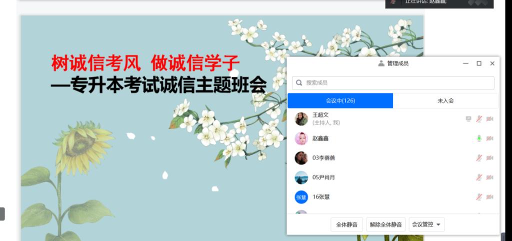 为做好专升本考试工作,严肃考试纪律,树立学生的诚信考试意识,太阳网集团tcy8722于3月15日中午12点30组织专升本考生召开专升本考试诚信教育主题班会,本次会议采取腾讯会议线上召开,会议由辅导员赵鑫鑫老师主持,20会专5、6、7、8班专升本同学参会。