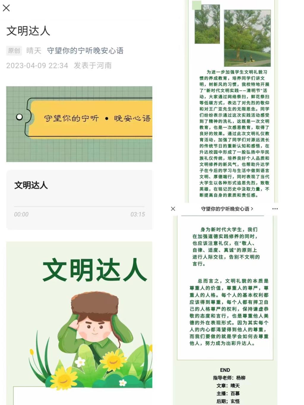 第三,杨柳老师通过指导的学生社团“守望你的宁听”网络社团,利用音频广播媒介的方式来宣传我校的文明礼貌教育活动,通过音频让更多的学生了解文明礼貌的意义,带动更多的学生参与到此项活动中,使更多的学生自觉养成讲文明、树新风的习惯,帮助更多学生在生活中做到语言文明、厚德端行。