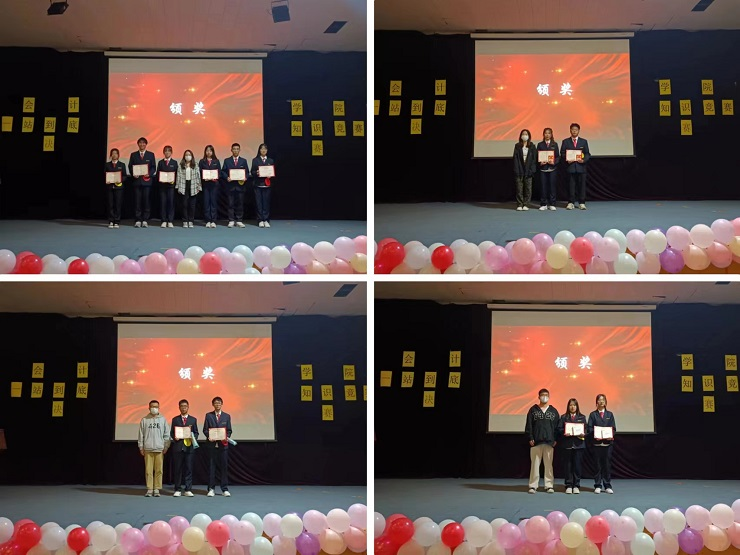 到了最激动人心的颁奖环节。由学生会副主席孙璇为优秀奖获得者22级会本7班、22级会本4班、22级会专5班颁发获奖证书并合影留念;由学生会副主席崔英丽为季军获得者22级税本1班颁发获奖证书并合影留念;由社联副理事长任旌旗为亚军获得者22级财本1班颁发获奖证书并合影留念;由团委书记助理谢振江为冠军获得者22级审本2班颁发获奖证书并合影留念;由学生会主席李文姗为道德风尚奖获得者22级会本8班、精神文明奖获得者22级税收2班、最佳组织奖获得者22级会本6班颁发获奖证书并合影留念。