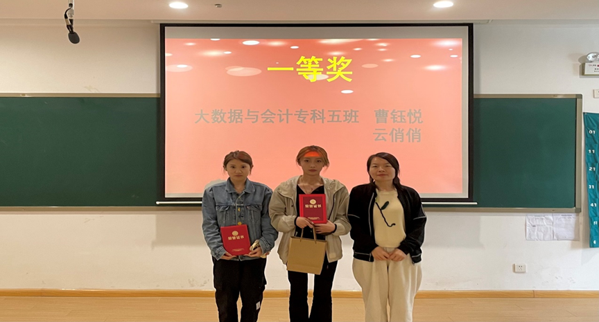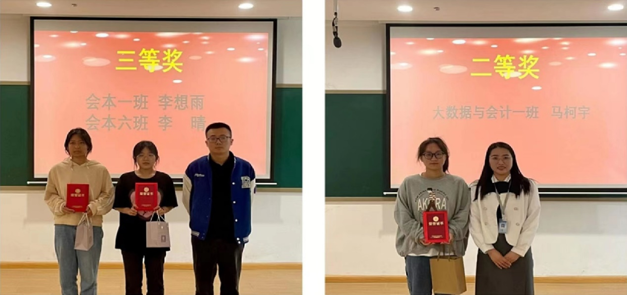 接下来是激动人心的颁奖环节。由任旌旗为三等奖获得者22级会本一班李想雨、22级会本六班李晴颁发获奖证书并合影留念;由胡淑娟老师为二等奖获得者22级大数据与会计专科一班马柯宇颁发获奖证书并合影留念;由支园园老师为一等奖获得者 22 级大数据与会计专科五班曹钰悦、云俏俏颁发获奖证书并合影留念。至此,本次青春思政社“5.4手抄报”活动颁奖仪式在同学们热烈的掌声中落下帷幕。