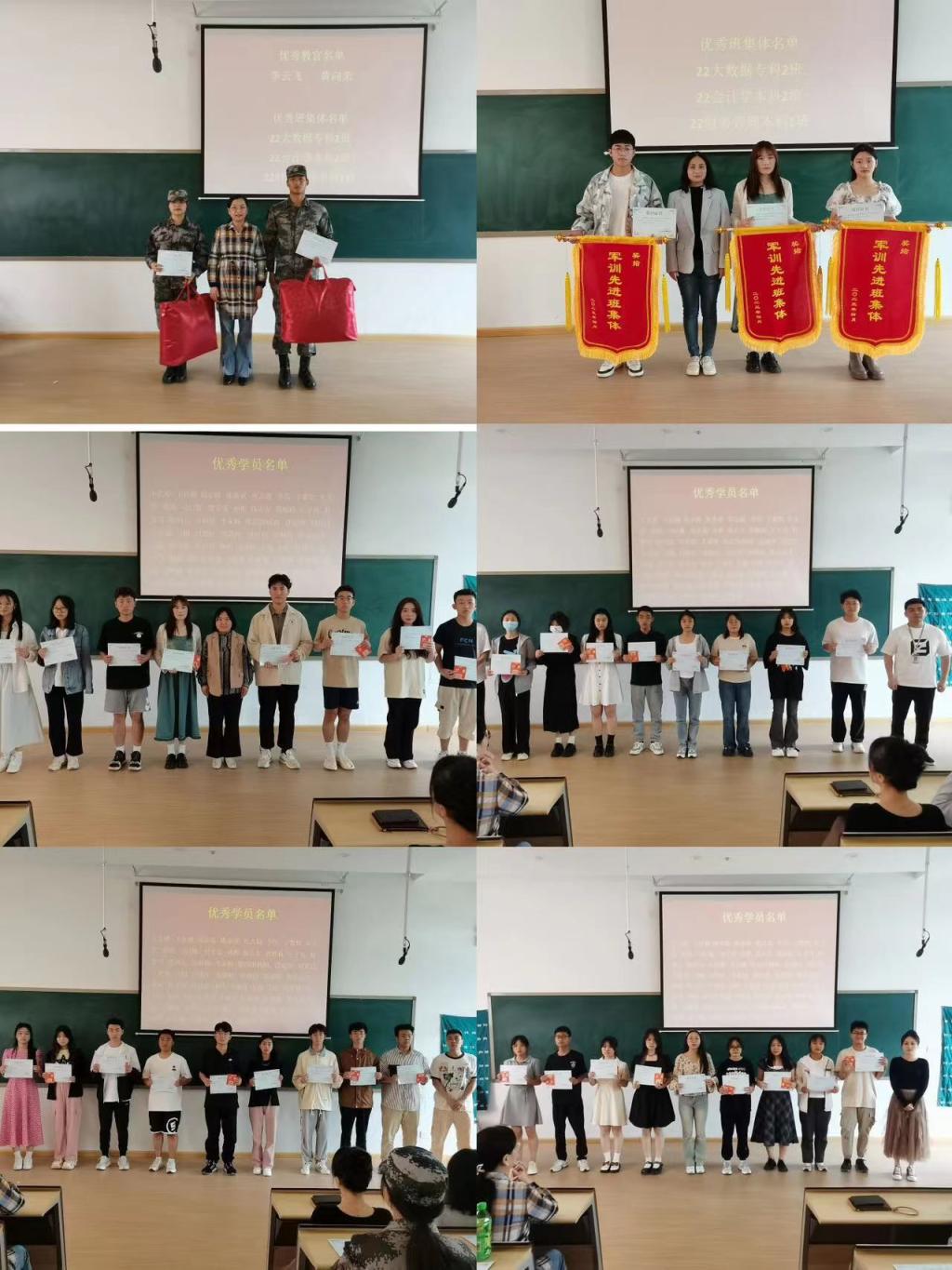 表彰大会在热烈气氛中开始。赵磊老师公布了获得本次优秀教官、优秀班集体、优秀学员和优秀指导老师名单。随后,举行了颁奖仪式,对获奖人员颁奖。李云飞、黄向荣获得“优秀教官”称号,22级会计与大数据专科二班、22级会本二班、22级财本一班获得了“优秀班集体”称号,2022级会本班一班王艺婷等59名同学获得了“优秀学员”称号,杨柳、路飞龙、赵磊获得“优秀指导老师”荣誉称号。