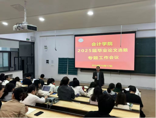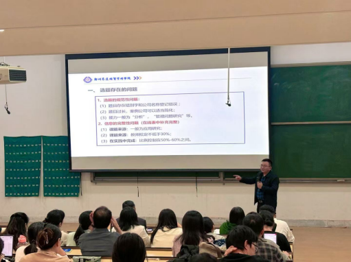 随后,张新成副院长就2025届论文选题工作和2022-2024届毕业论文自查工作进行了重点部署。他首先强调了论文题目选择的重要性及关注要点,论文题目的选择应基于学校地方应用型高校的定位,着重关注选题的创新性和实用性,并鼓励指导教师在指导学生在论文形式上采用案例分析以外的学术论文、创新创业实践、调查研究报告以及实证论文等形式,在研究过程中要严格遵守学术规范,确保论文的质量。