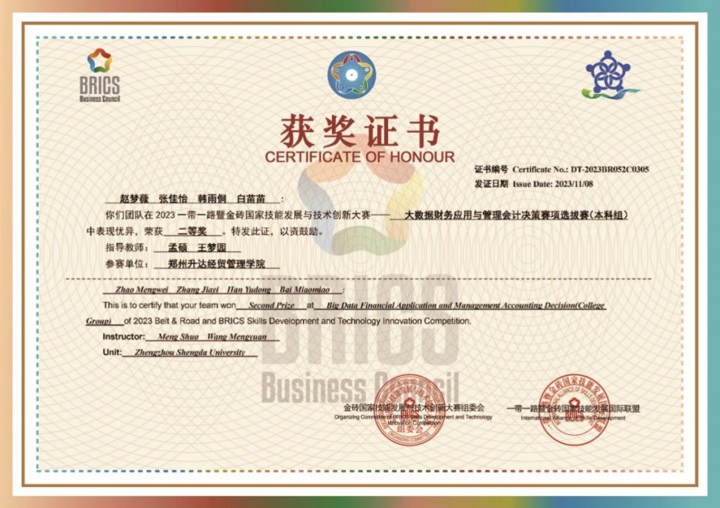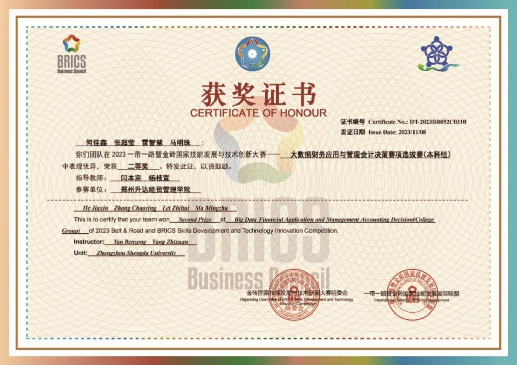 会计学子在2023“一带一路”暨金砖大赛之大数据财务应用与管理会计决策赛项中获奖