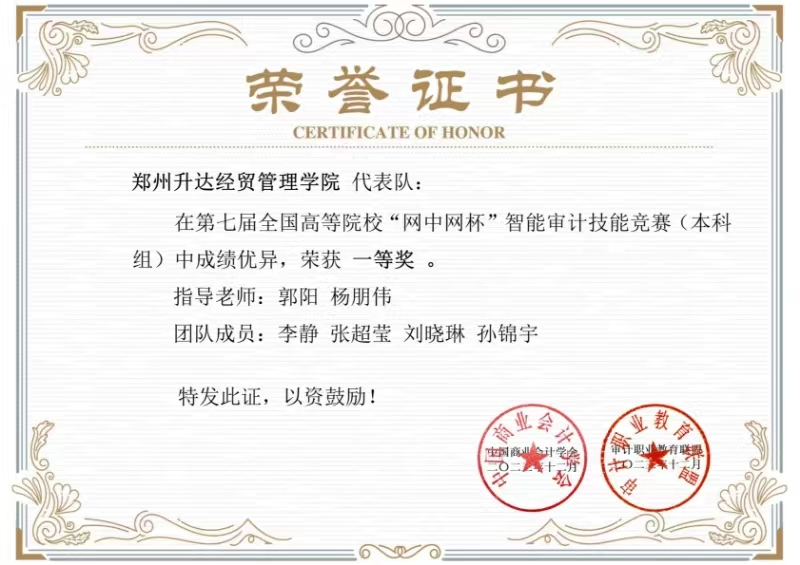 我校太阳网集团tcy8722共组建1支代表队,选派李静、刘晓琳、孙锦宇、张超莹四位同学组成团队参赛,由审计教研室的杨朋伟、郭阳两位老师担任指导教师。经过老师们一个多月的悉心指导和同学们的刻苦训练,最终我校代表队在全国总决赛129支队伍中脱颖而出,与哈尔滨商业大学、哈尔滨师范大学等13所高校同获全国一等奖,我校是本次竞赛中河南省唯一一所获得一等奖的高校。