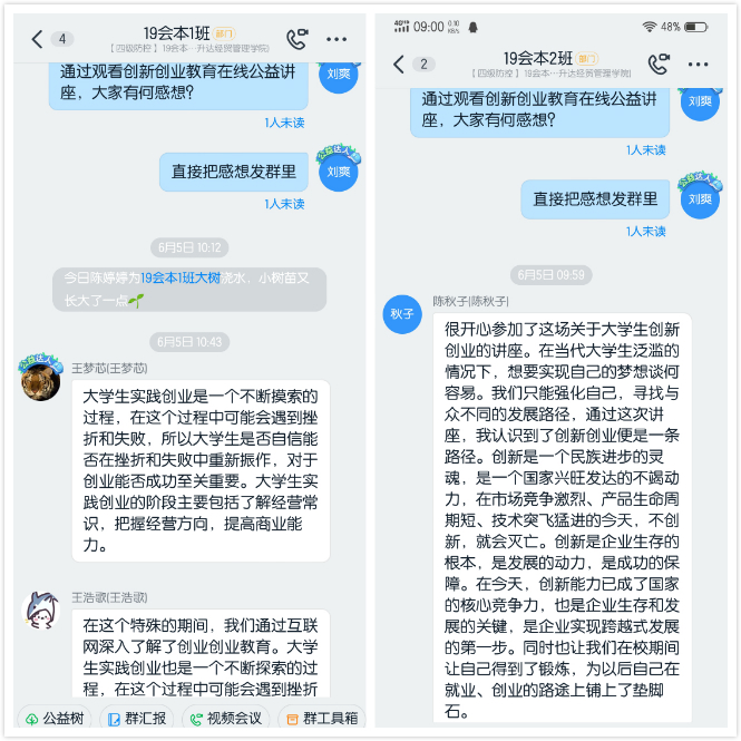 辅导员老师认真收集和整理截图和心得体会,从中遴选优秀心得体会,分门别类进行统计和分析,发掘学生的关注点,期待后期能够有针对性得帮助同学们创新创业和促进就业。