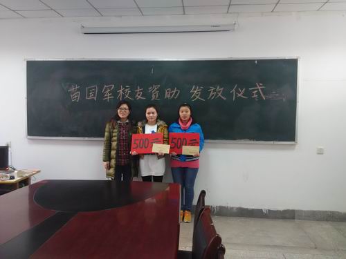 按照资助者的意愿,通过层层筛选,获得本次“苗国军校友助学金”的分别是表现突出、品学兼优的2014级会本12班张艳梅同学和2014级会升本2班王肖杰同学,由张欣主任为他们每人颁发500元助学金。