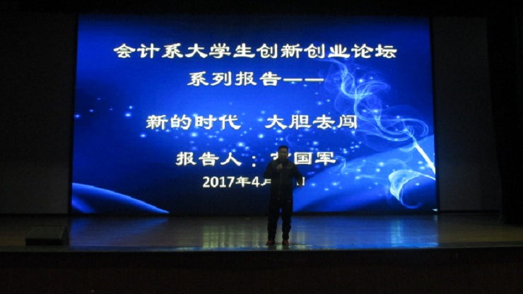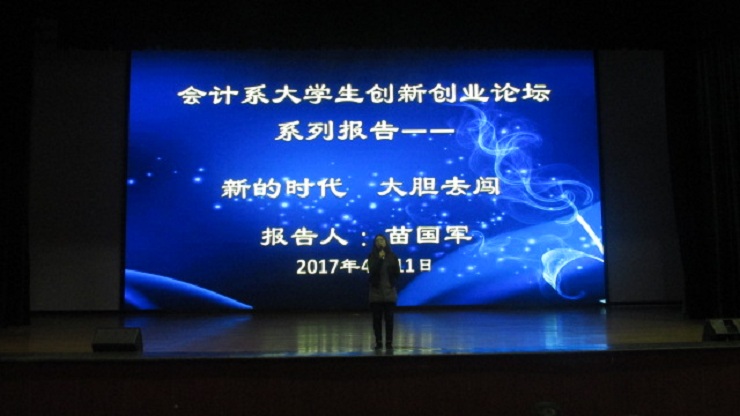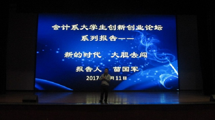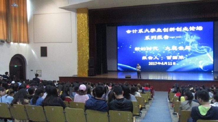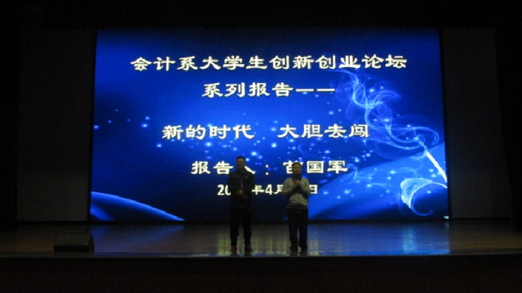 为鼓励大学生迎接新机遇积极创业, 4月11日下午2:20,会计系特邀我院优秀校友苗国军董事长、袁宁先生于思源会馆举办以“新的时代,大胆去闯”为主题的创业指导报告会。苗国军董事长:我院94级会计系优秀校友,历任郑州三全食品股份有限公司副总裁、洛阳杜康销售有限公司总经理、“好想你”枣业股份有限公司总经理、现任1919酒类供应链管理股份有限公司股东、首席品牌官及河南1919董事长;袁宁先生,前任升达全国校友会总会长,我院94级国贸系优秀校友。出席本次报告会的有:学院副院长兼会计系主任张欣副教授,会计系行政秘书兼团委书记陈刚老师、行政秘书刘锦老师、会计系部分辅导员老师以及近会计系2000名学生。
