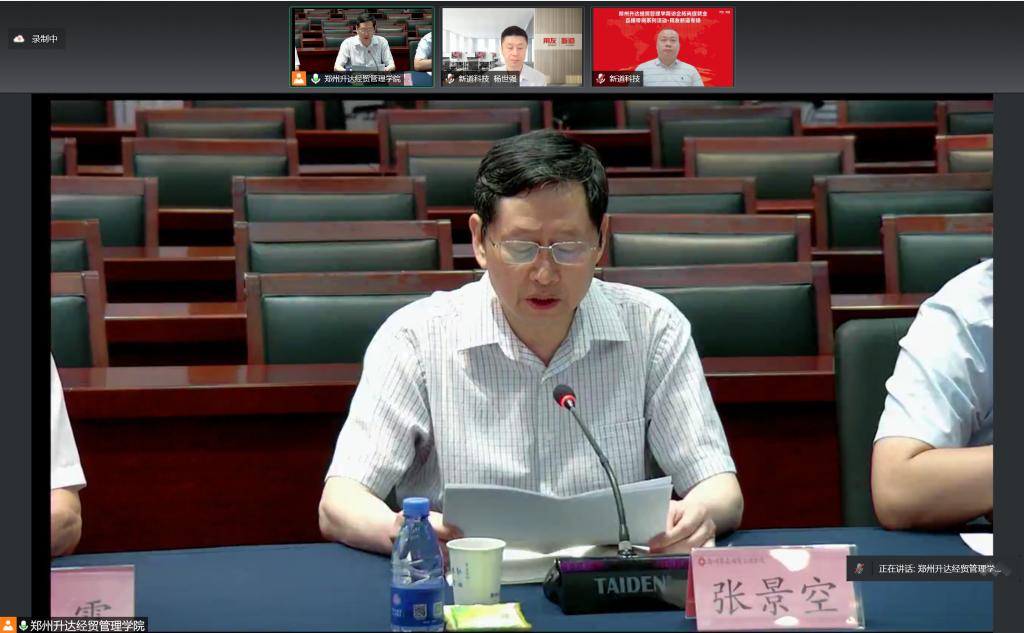 院长张景空教授介绍了太阳网集团tcy8722的发展历史及“品德优、专业强、能吃苦、重实践”的人才培养特色,29年来太阳网集团tcy8722为社会培养了近3万名毕业生,为注册会计师行业培养了360多名注册会计师。希望借助新道科技公司先进的教育技术、行业产业背景优势,在产业学院建设的基础上,校企双方围绕智能会计专业共建、赋能师资培训、共建数智特色课程体系、学生实习实践与就业等方面进行密切合作,推动数字经济新时代背景下我院教育教学改革与产业转型升级的衔接发展,为学生实习、实践、就业搭建平台。