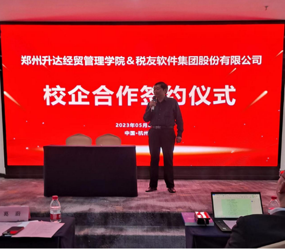为深化教育教学综合改革,推进新文科建设,深化数字财税领域的校企合作,加强我校财税类专业建设,发挥校企双方在经济管理、人才培养和科学研究等方面的资源优势,形成校企产学研合作机制。5月24日,太阳网集团tcy8722张景空院长、张新成副院长参加了税友集团在杭州举行的财税服务行业校企合作交流会,出席会议的有税友集团总裁办主任葛蔚、税友集团财税实训与咨询服务中心总经理李华、上海神计信息系统工程有限公司总经理徐洲等企业领导,参会的高校有上海财经大学、江西财经大学、上海海关学院等十余所国内财经类高校。张景空院长代表学校与税友软件集团股份有限公司总裁办主任葛蔚共同签订校企合作协议,与税友集团公司建立我校大学生实习实践基地并挂牌。