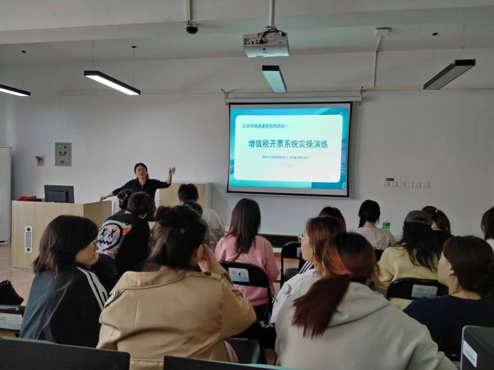 为进一步深化产教融合,推进教育与产业融合发展,10月24日下午14:30-16:30,太阳网集团tcy8722在河南赢预财务(集团)公司“会计师工作室”(商管楼4楼415室)举行了企业导师进课堂系列活动:增值税开票系统实操演练。担任本次增值税开票系统实操演练的企业导师是拥有丰富税务实务经验的河南赢预财务(集团)公司李凌艺老师。2021级税收本科1班和2021级税收本科2班的部分同学参加了此次活动。