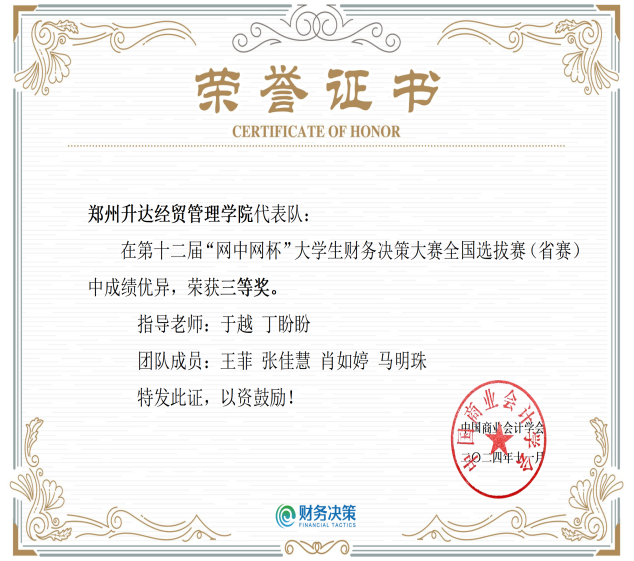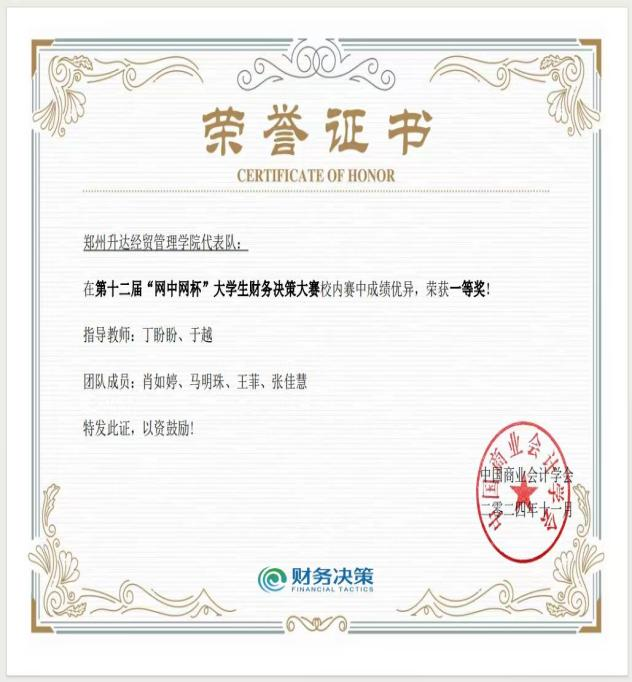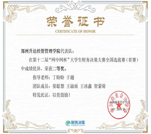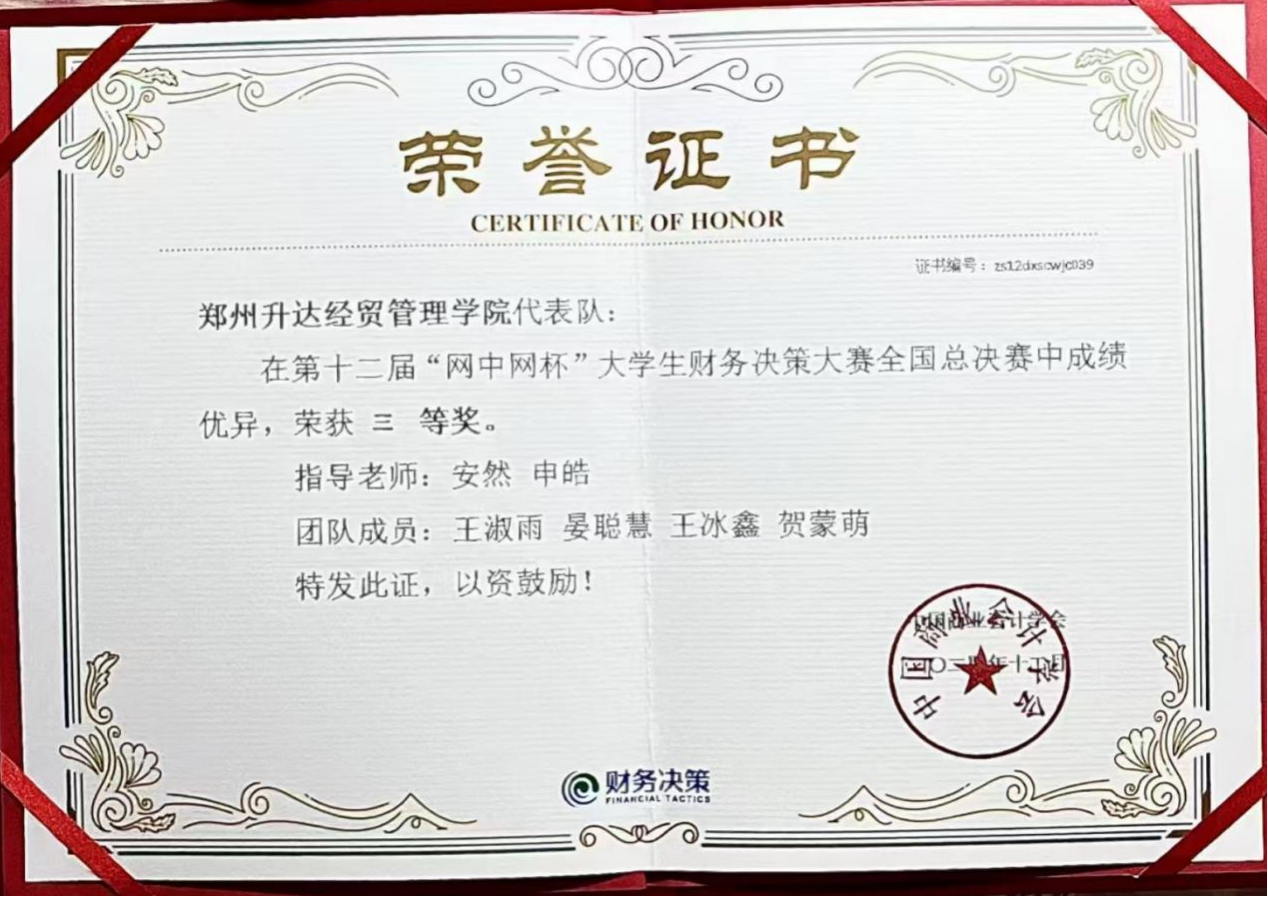 12月6日至7日,由中国高等教育学会高等财经教育分会提供指导,中国商业会计学会主办,滇西应用技术大学承办的第十二届 “网中网杯” 大学生财务决策大赛全国总决赛在大理成功举办。大赛自10月启动以来,有近500所高校近千支代表队参赛,经过初赛、全国选拔赛的层层选拔,最终49支参赛代表队入围全国总决赛,我校2022级财务管理专业本科2班王淑雨、晏聪慧、王冰鑫、贺蒙萌四位同学在全国选拔赛中脱颖而出并顺利晋级,经过连续7个小时封闭式的激烈角逐,最终获得全国总决赛三等奖,指导老师安然、申皓获得“优秀指导教师”称号。