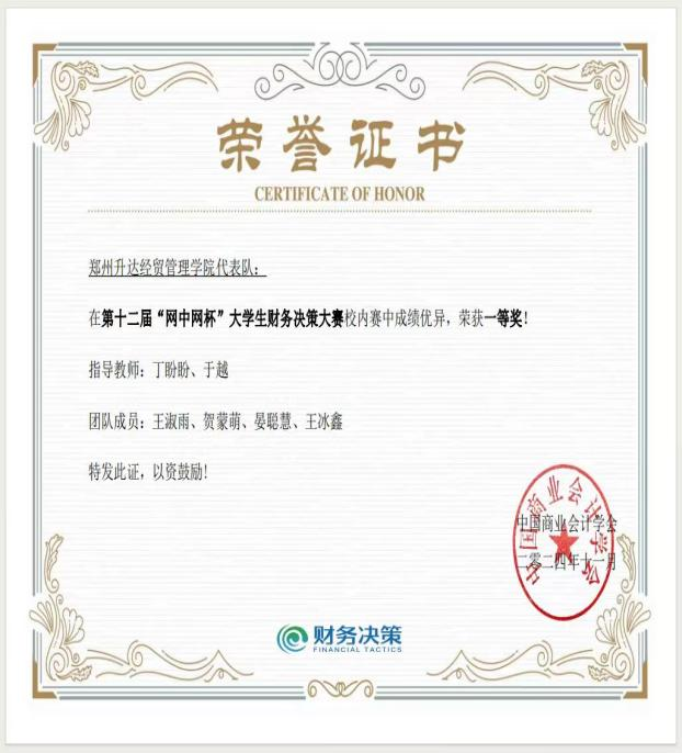 2024年11月17日,于越和丁盼盼两位老师组织两支队伍参加大学生财务决策大赛全国选拔赛,由王淑雨、贺蒙萌、晏聪慧、王冰慧四位同学组成的“恒优电器有限公司”顺利晋级全国总决赛。
