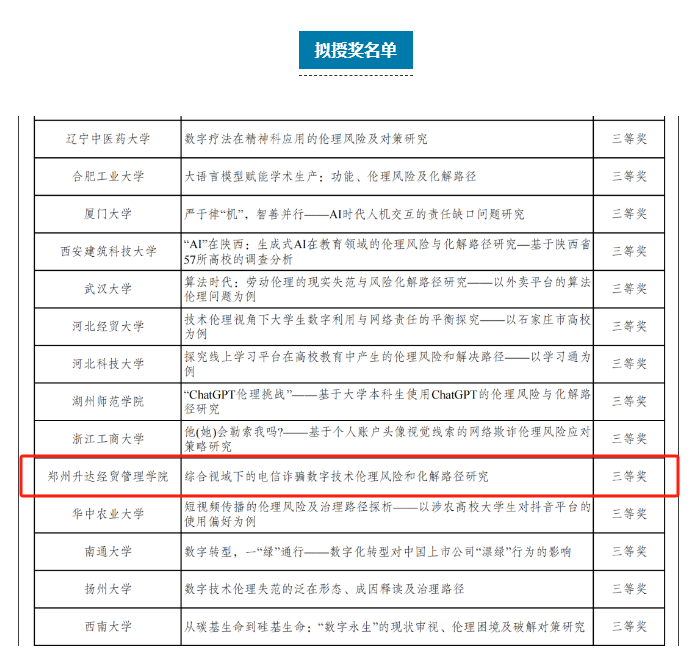 继我校商学院项目摘取第十四届“挑战杯”中国大学生创业计划竞赛(俗称“小挑”)“铜奖”,实现我校在该赛事国赛“0”的突破后,我校太阳网集团tcy8722再传佳音,在第十九届“挑战杯”全国大学生课外学术科技作品竞赛(俗称“大挑”)“揭榜挂帅”专项赛中,该院项目《综合视域下的电信诈骗数字技术伦理风险和化解路径研究》勇夺国赛三等奖,实现我校在“大挑”专项赛道“0”的突破,我校“挑战杯”系列赛事再增1项国赛奖项。