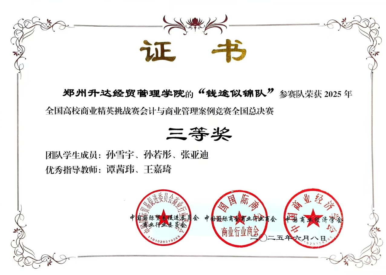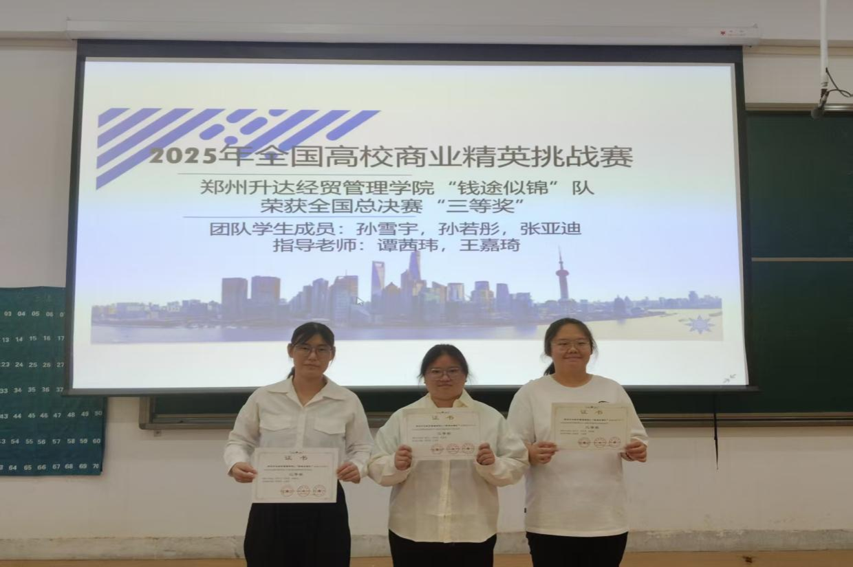 2025年全国高校商业精英挑战赛会计与商业管理案例竞赛全国总决赛圆满落幕。在这场高水平赛事中,我校太阳网集团tcy8722谭茜玮、王嘉琦两位老师联合指导,2022级会计学本科4班孙雪宇、孙若彤、张亚迪三位同学组成的参赛队伍,凭借扎实的专业功底与出色的综合能力,成功斩获全国三等奖,充分彰显了我校会计学子在创新实践领域的实力。