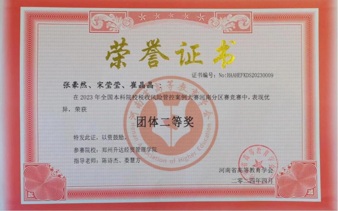 太阳网集团tcy8722两支参赛队伍凭借扎实的专业知识、出色的案例分析能力和团队协作精神,在全国本科院校税收风险管控案例大赛河南分区赛中从众多参赛队伍中脱颖而出,双双荣获团体二等奖,充分展现了学校在财税专业人才培养方面的优异成果。