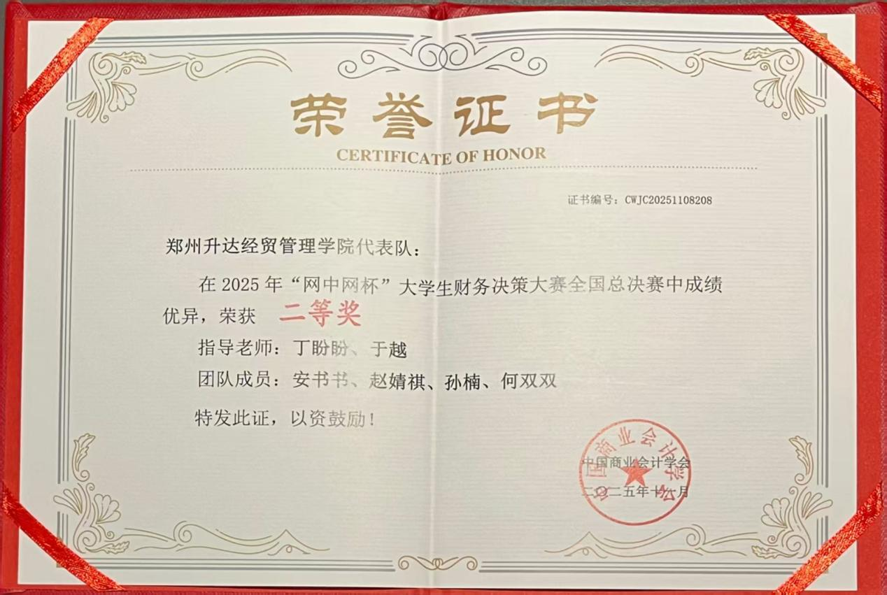 作为团体赛事,每支参赛队伍由四名选手组成。我校太阳网集团tcy8722丁盼盼、于越两位老师悉心指导的“深藏不露队”凭借扎实的专业功底、敏锐的决策思维与默契的团队协作,成功斩获全国二等奖,在河南省参赛队伍中高居榜首。该团队成员为2023级税务本科1班的赵婧祺、何双双、安书书、孙楠四位同学。