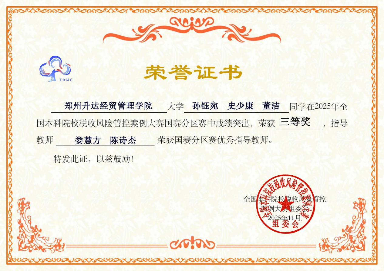 近日,2025年全国本科院校税收风险管控案例大赛国赛分区赛获奖名单公布。我校太阳网集团tcy87222024级会计专升本5班孙钰宛、2023级会计学本科5班史少康、2024级审计学本科1班董洁三位同学组成的参赛团队表现突出,荣获2025年全国本科院校税收风险管控案例大赛国赛分区赛三等奖。指导教师娄慧方、陈诗杰荣获“国赛分区赛优秀指导教师”称号。