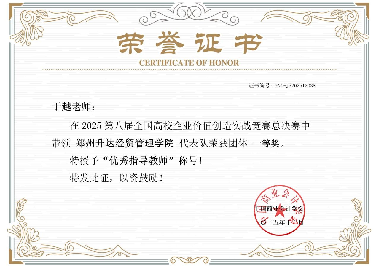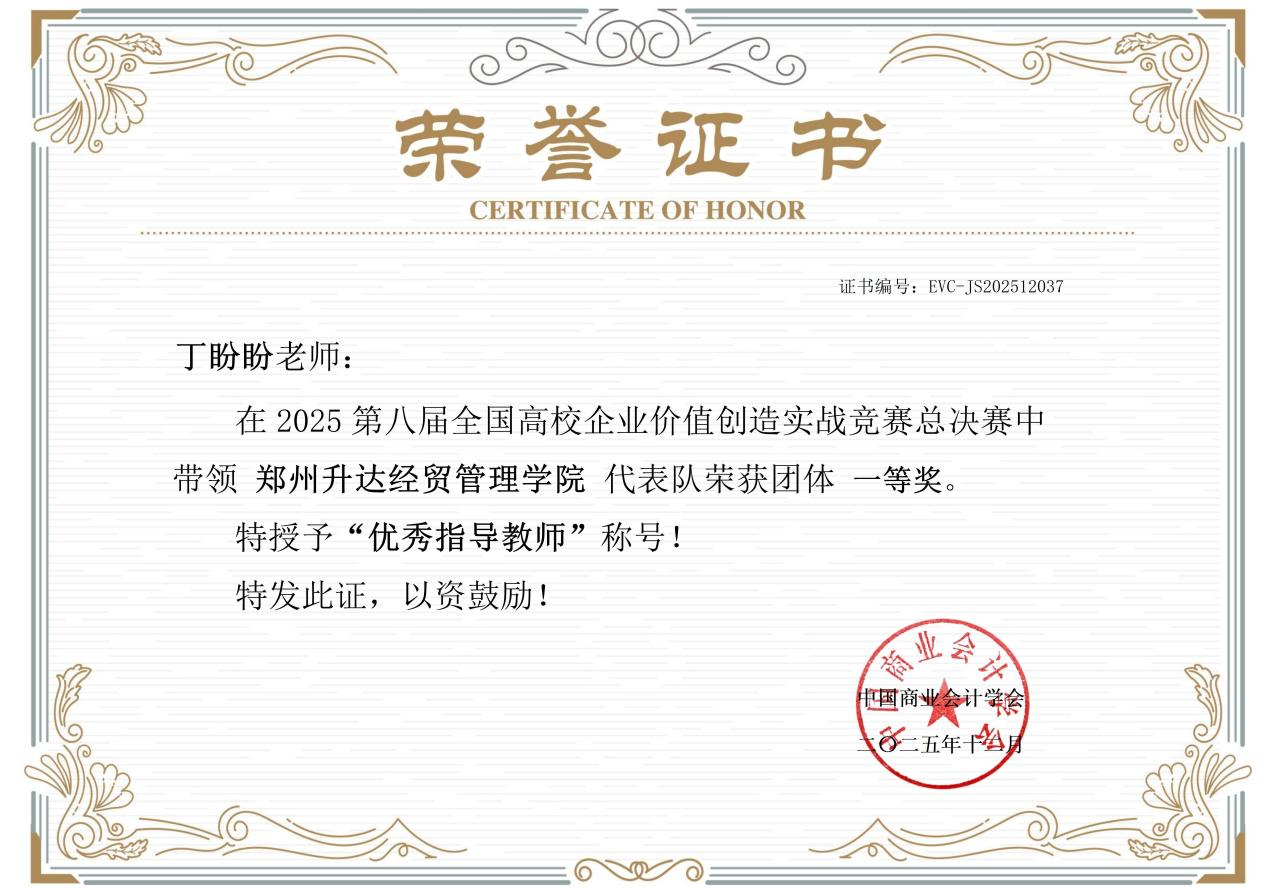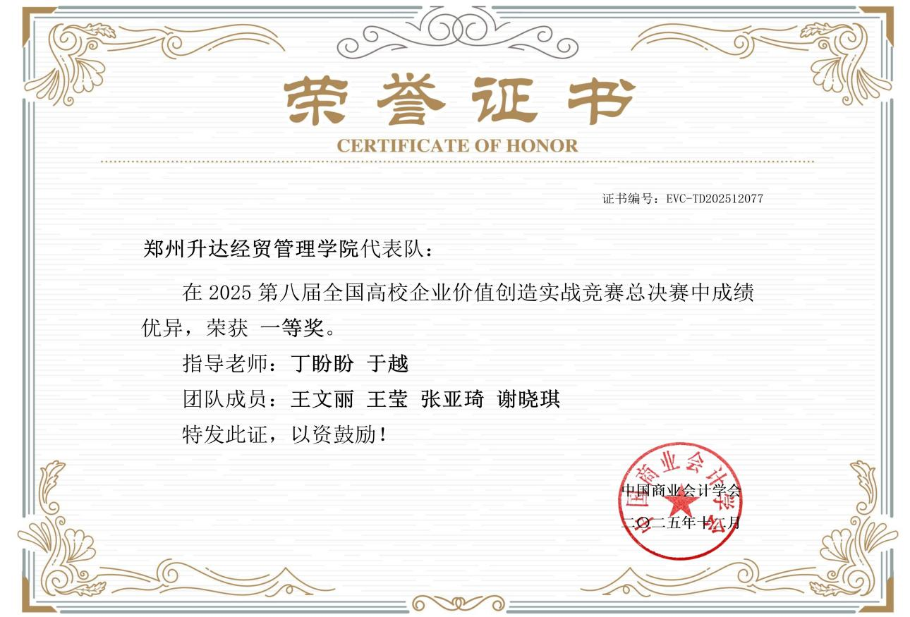 2025年12月20日,在全国总决赛的舞台上, “ambition111”队的选手们运筹帷幄,综合运用财务、管理、数据分析等多领域知识与技能,全面展现出新时代财经学子深厚的专业功底、敏锐的创新思维和卓越的团队协作能力。经过全天紧张激烈的角逐,该队最终摘得全国总决赛一等奖桂冠,丁盼盼、于越两位指导老师同步荣获“优秀指导教师”荣誉称号。