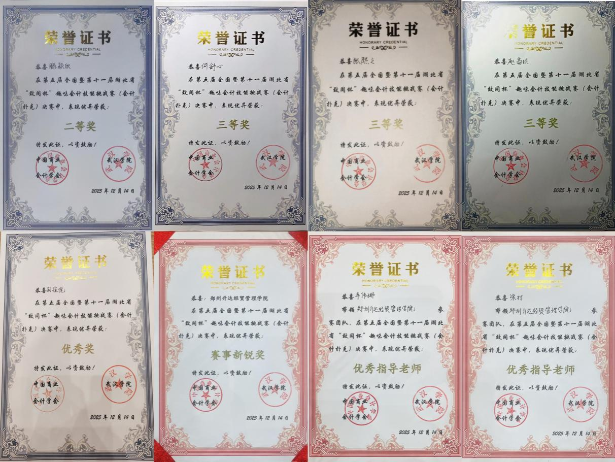 学校及学院各级领导高度重视此次比赛。通过选拔,有两支队伍、八名队员脱颖而出,代表学校参加决赛。赛场上会计学子与南京审计大学、中南民族大学等高校选手同台竞技,不畏强手,冷静出牌,经过激烈的角逐,2023级会计本科1班的董梦圆同学荣获一等奖、2023级会计本科1班的滕颍欣同学荣获二等奖、2023级会计本科1班的张熙之、赵商琰、何舒心三位同学荣获三等奖、2023级会计本科7班的孙佳悦同学荣获优秀奖,车伟娜老师和梁村老师荣获优秀指导老师,我校荣获“赛事新锐奖”,成绩喜人。