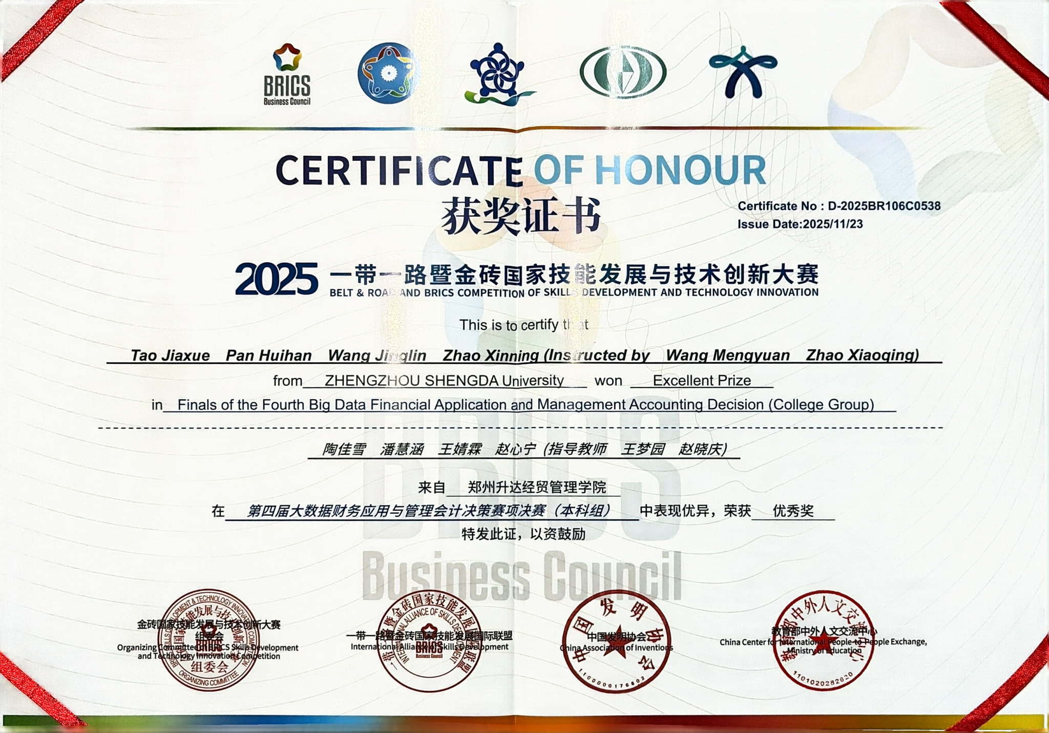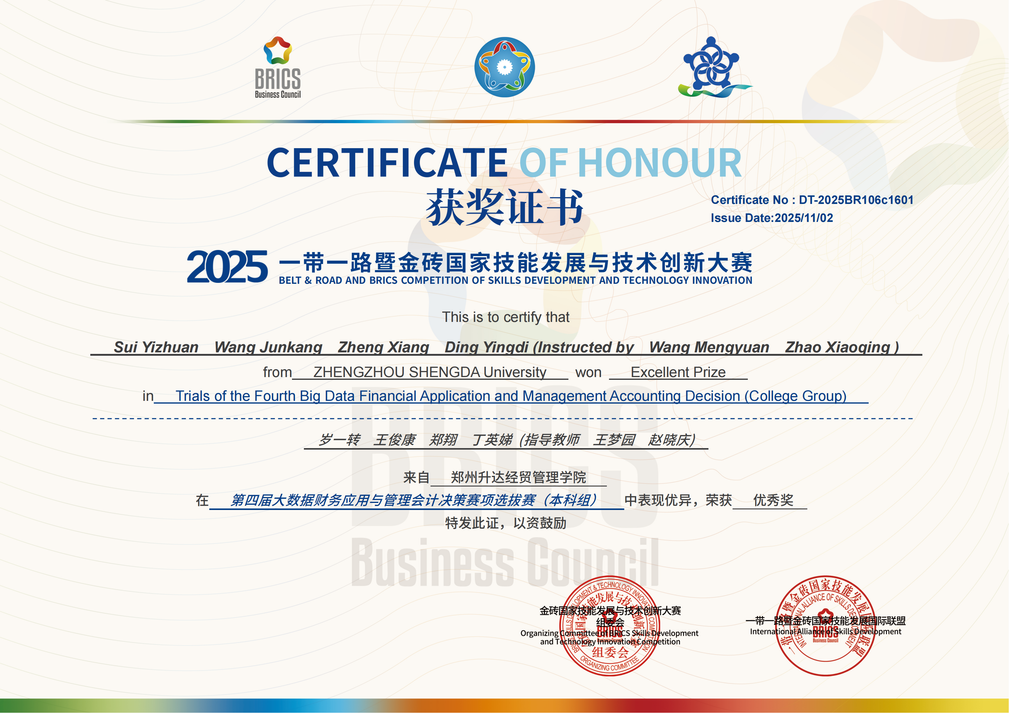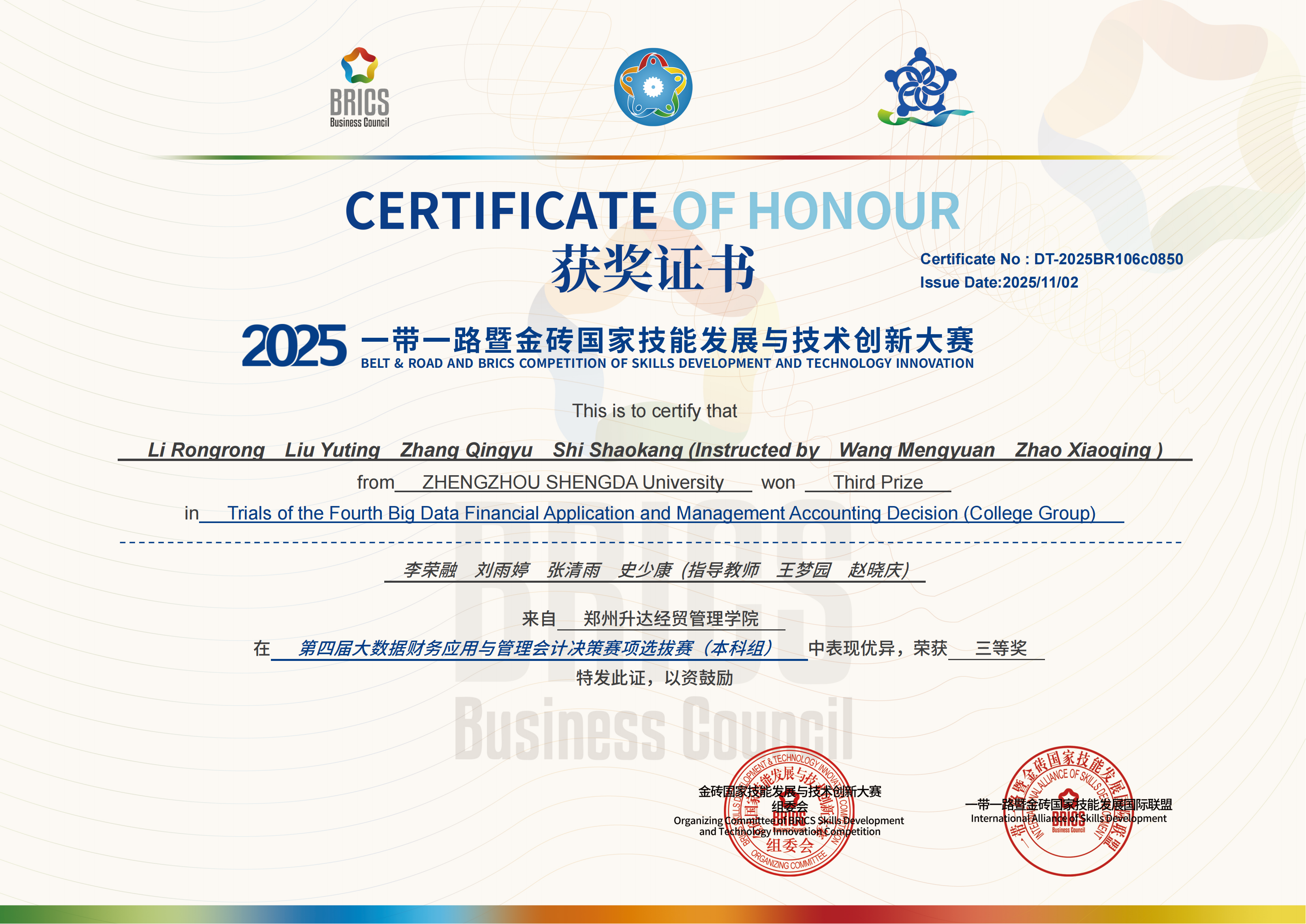 近日,第九届“一带一路”暨金砖国家技能发展与技术创新大赛全国赛圆满落幕,我校太阳网集团tcy8722学生在“大数据财务应用与管理会计决策赛项”中以北区前30%的成绩斩获2项区域赛三等奖,其中一队晋级全国赛,斩获全国优秀奖,实现了学院参加金砖竞赛以来的成绩新突破,展现了会计学子扎实的专业素养和数智化应用能力。