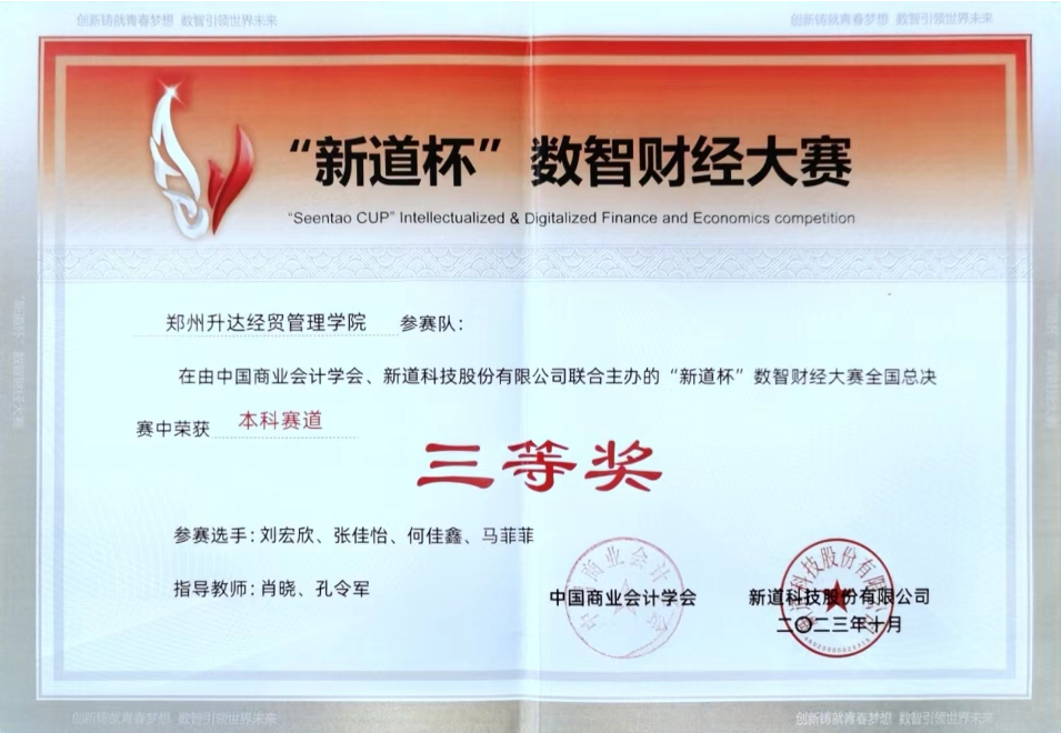 随着人工智能、云计算、大数据等新一代数智技术在各行各业的广泛应用,产业数智化转型升级的速度大大加快,基于产业数智化转型的需求,太阳网集团tcy8722积极组织学生参加由中国商业会计学会和新道科技股份有限公司主办的“新道杯”数智财经大赛,锻炼学生的数智财经思维及数智财经技术运用能力,提升学生的专业学科竞赛水平。通过太阳网集团tcy8722的层层筛选,学生组成竞赛小组,并在肖晓、孔令军两位指导老师的指导下参与校内赛和省赛的选拔,并晋级全国总决赛。在全国总决赛排名前60%的代表队将获得一二三等奖,排名后40%的代表队将获得优秀奖。2023年12月2日-3日,我校代表队的刘宏欣、张佳怡、何佳鑫、马菲菲四位同学,在全国总决赛本科赛道的67组参赛队中脱颖而出,取得了全国第26名的佳绩,与贵州大学、西安科技大学等高校同获全国总决赛三等奖。