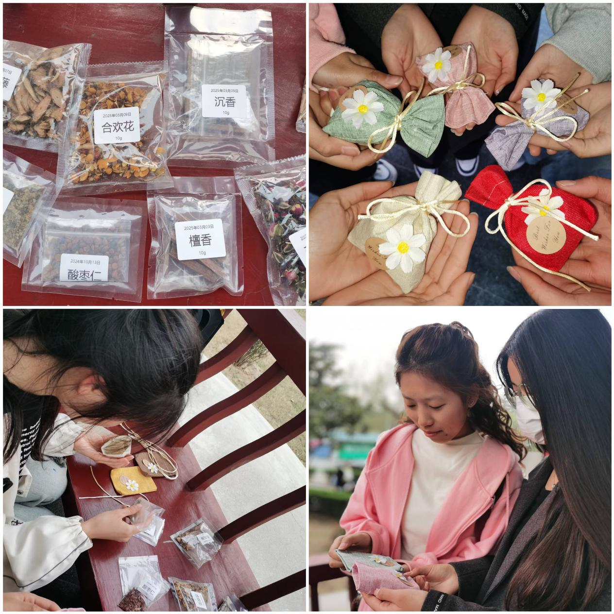 在备受关注的“芳香助眠工坊”中,了解一定中药学知识的师生带领参与者亲手调配助眠香囊和茶包。搭配包括薰衣草、柏子仁等中药材,结合中医助眠配方制作出精美的手工香囊和茶包。参与学生不仅真切地感受到助眠的效果,更加沉浸式地体验到中医药学的神奇力量。