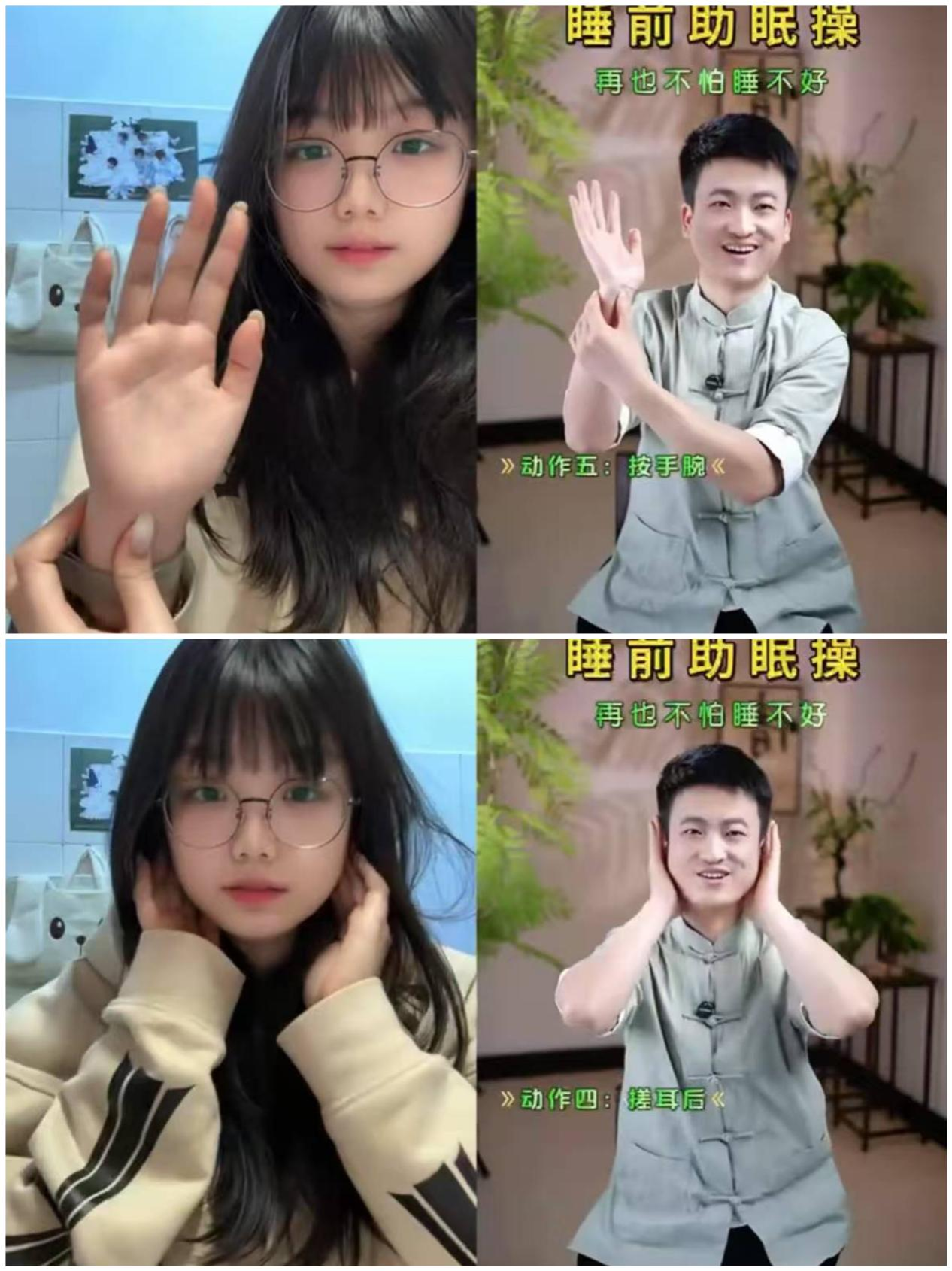 “晚安操云打卡”活动中,同学们通过专业教学视频学习脊柱放松、呼吸调节、瑜伽拉伸等睡前训练动作,在班级群或朋友圈发布打卡视频。参与的同学反馈入睡时间缩短30分钟以上,睡眠质量显著提高。