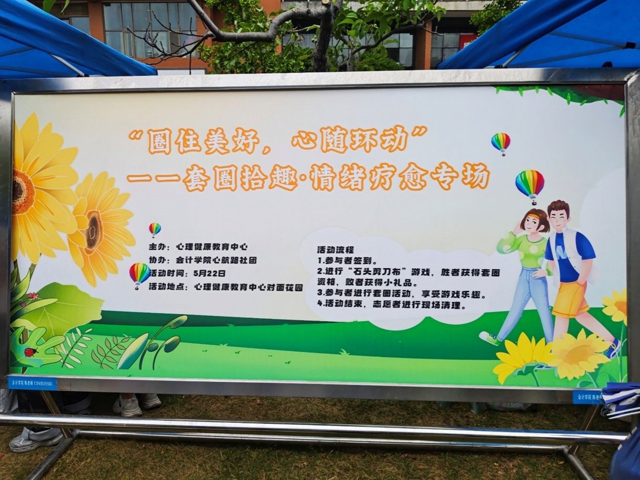为了进一步增强会计学子的交流与互动,帮助同学们提升情绪管理能力,增强心理健康意识,推动心理健康知识广泛传播,营造积极向上的校园心理氛围。5月22日,由校心理健康教育中心主办、太阳网集团tcy8722团委及心航路社团协办的“圈住美好,心随环动”——套圈拾趣·情绪疗愈专场心理健康活动于学苑会馆东侧花园成功举办。在活动筹备阶段,社团充分发挥心理委员群的桥梁作用,通过生动的图文介绍、富有感染力的文案,将活动亮点一一呈现,成功点燃了同学们的参与热情,为活动的顺利开展奠定了良好基础。
