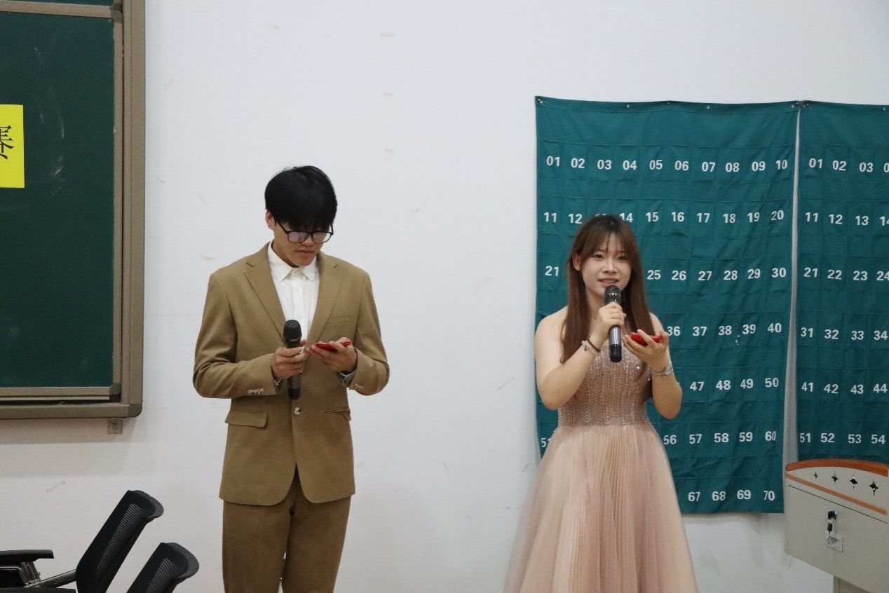 竞赛环节精彩纷呈,“幸运盲盒”环节,选手们沉着冷静,面对选择题默契讨论、迅速作答,为队伍积累基础分;“勇者制胜”环节,各队谨慎选择题型,无论是选择题的精准判断,还是简答题的条理阐述,都彰显出扎实的知识储备;“听歌识曲”环节将气氛推向高潮,8道抢答题让各队摩拳擦掌,抢答声此起彼伏,选手们反应敏捷,激烈角逐;“赏英雄图,鉴红色故事”环节,通过图文解析,选手们回顾红色历史,准确说出人物姓名与相关事件,重温党团奋斗历程;“决斗时刻”中,剩下两个小组围绕时事政治互问互答,展开深度思想碰撞,逻辑清晰的论述赢得阵阵掌声。表演环节王怡囡同学和杨晓羽同学带来歌曲《云烟成雨》,以动听的歌声赢得阵阵喝彩,最后孟丽君老师上台致辞,她首先肯定了此次党团知识竞赛举办的意义,强调其对促进同学们学习党团知识、增强政治意识和集体荣誉感的积极作用,鼓励大家持续深入学习党团知识,将理论运用到实践中,在日常学习生活中发挥先锋模范作用。