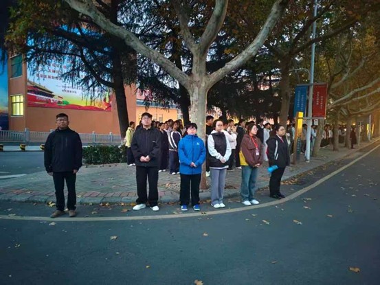 “全体肃立!”指令落下,鲜红夺目的五星红旗已悄然升至国旗台。紧接着,“向国旗——敬礼”的铿锵口令响彻清晨校园,在场全体师生瞬间精神抖擞,纷纷面向国旗肃立,以最庄重的注目礼致敬国旗。