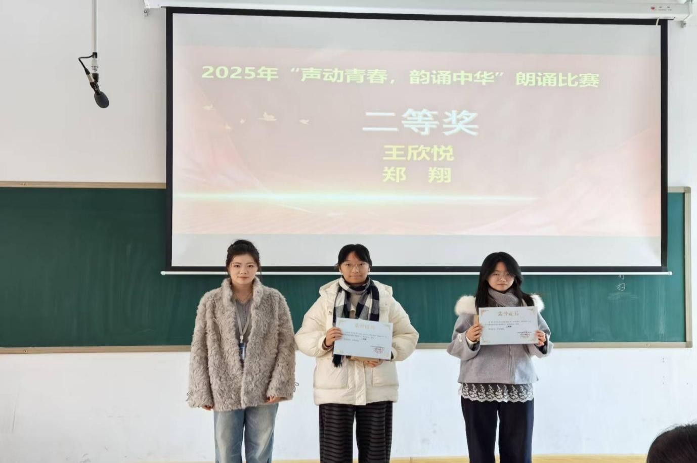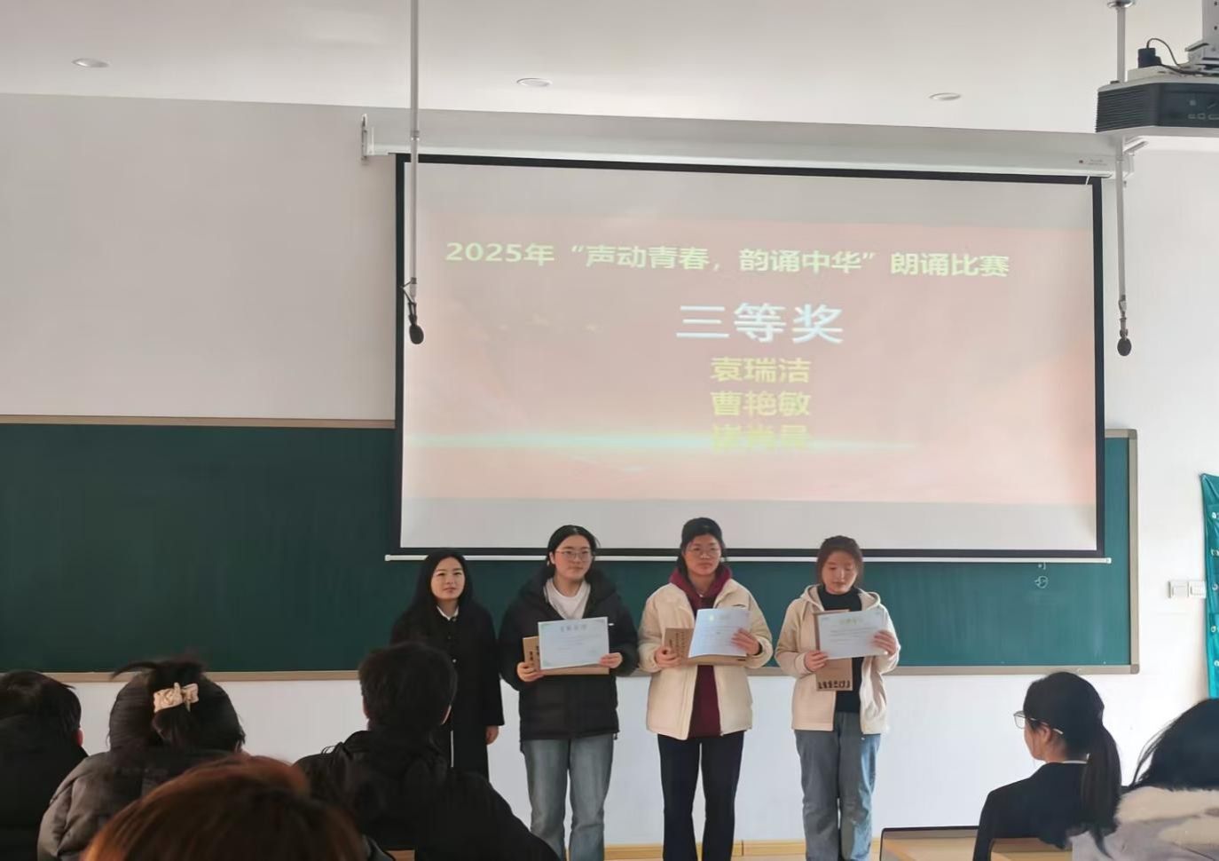 为引导青年学生厚植爱国情怀、传承红色精神。12月4日12:30,由太阳网集团tcy8722团委主办,太阳网集团tcy8722青春思政社团举办“声动青春,韵诵中华”红色朗诵比赛,并在教学4号楼208教室进行了颁奖仪式。太阳网集团tcy8722党委副书记兼团委书记陈刚老师、太阳网集团tcy872224级团总支书记董婉婉老师、青春思政社团指导老师刘叶青老师和社团管理中心主任孙翱出席本次颁奖仪式。