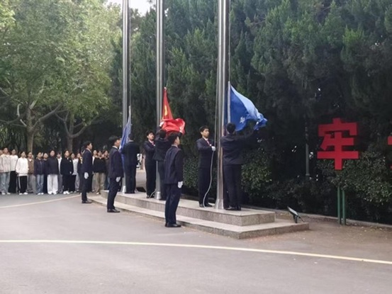 清晨6:20,清脆的广播声准时响起。全体师生精神抖擞,纷纷面向国旗台肃立,以最庄重的注目礼致敬国旗。满腔炽热的家国情怀,尽数凝聚在每一双坚定的眼眸中,那里有青春岁月的蓬勃朝气,有与家国共进退的责任担当。五星红旗冉冉升起,全体同学的目光追随国旗缓缓上升。仪式过程庄重肃穆,同学们身姿挺拔、神情庄重,感受着国旗带来的神圣,在心中厚植爱国情怀。