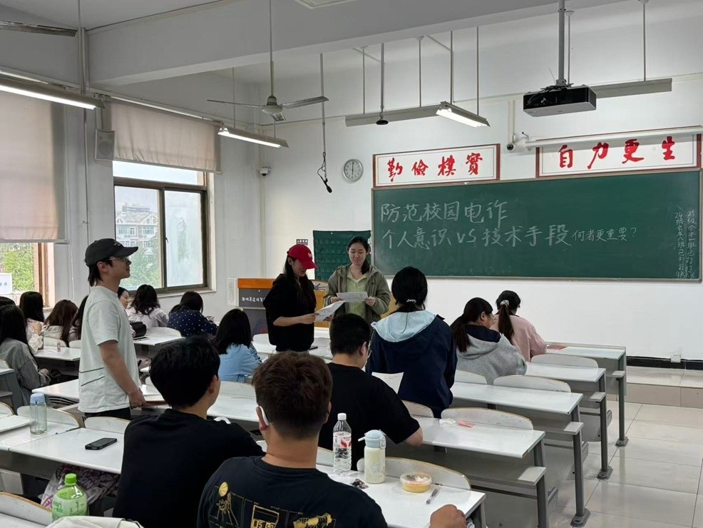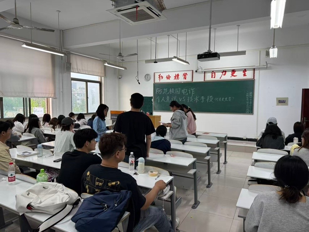 活动前期,团支部组织团员系统学习了校园电信诈骗的常见类型、防范知识及典型的真实案例,普及反诈基础常识。在此基础上,通过自愿报名组建正反两支辩论队伍,明确辩手分工。各队围绕辩题广泛搜集论据、梳理论点,为辩论赛的顺利开展做好充分准备。辩论赛严格按照开篇立论、攻辩质询、自由辩论、总结陈词四个环节有序进行。正方辩手从技术手段的预警拦截、精准防控优势出发,论证其在反诈中的重要作用;反方辩手则立足个人意识的主观能动性与根源防范性,强调思想警惕是防范诈骗的核心关键。双方逻辑清晰、旁征博引,现场交锋激烈,深入剖析了技术与意识在反诈工作中的辩证关系。辩论结束后,设置了互动环节。团员们结合自身经历踊跃分享反诈感悟与应对心得,在交流中进一步加深了对反诈知识的理解和记忆。大家纷纷表示,通过辩论与讨论,更加清晰地认识到“技术+意识”双防线的重要性。