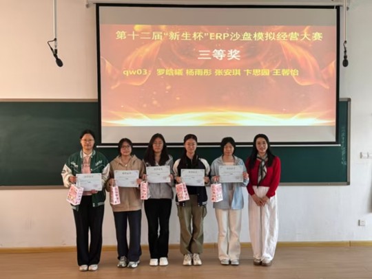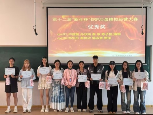 颁奖环节,刘东老师、胡淑娟老师、崔杰老师和陈刚老师分别为获得本次比赛优秀奖、三等奖、二等奖和一等奖的同学颁奖。获奖团队代表在分享心得时表示,此次大赛让大家真切体会到“知行合一”的重要性,在反复推演与实战对抗中,不仅熟练掌握了ERP沙盘运营技巧,深化了对财务管控核心的认知,更在团队协作中收获了成长与友谊,深刻认识到合理决策、高效配合对企业发展的重要意义。