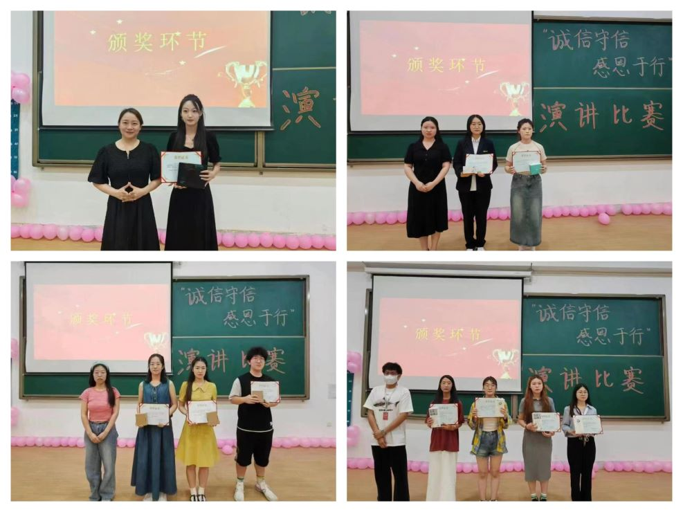 伴随着主持人宣读本次演讲大赛的要求和评分细则,活动拉开帷幕。选手们按顺序依次登台,他们结合自身经历,用朴实的语言、真挚的情感,阐述了诚信和感恩的重要性,表达了对守信感恩的推崇,用真挚的情感和出色的演讲赢得了评委和观众的一致好评。比赛结束后评委进行现场评选,由胡翔宇老师、姜早阳老师、29届学生会主席申含、书记助理刘嘉兴分别为荣获一等奖、二等奖、三等奖、优秀奖的同学进行了颁奖。
