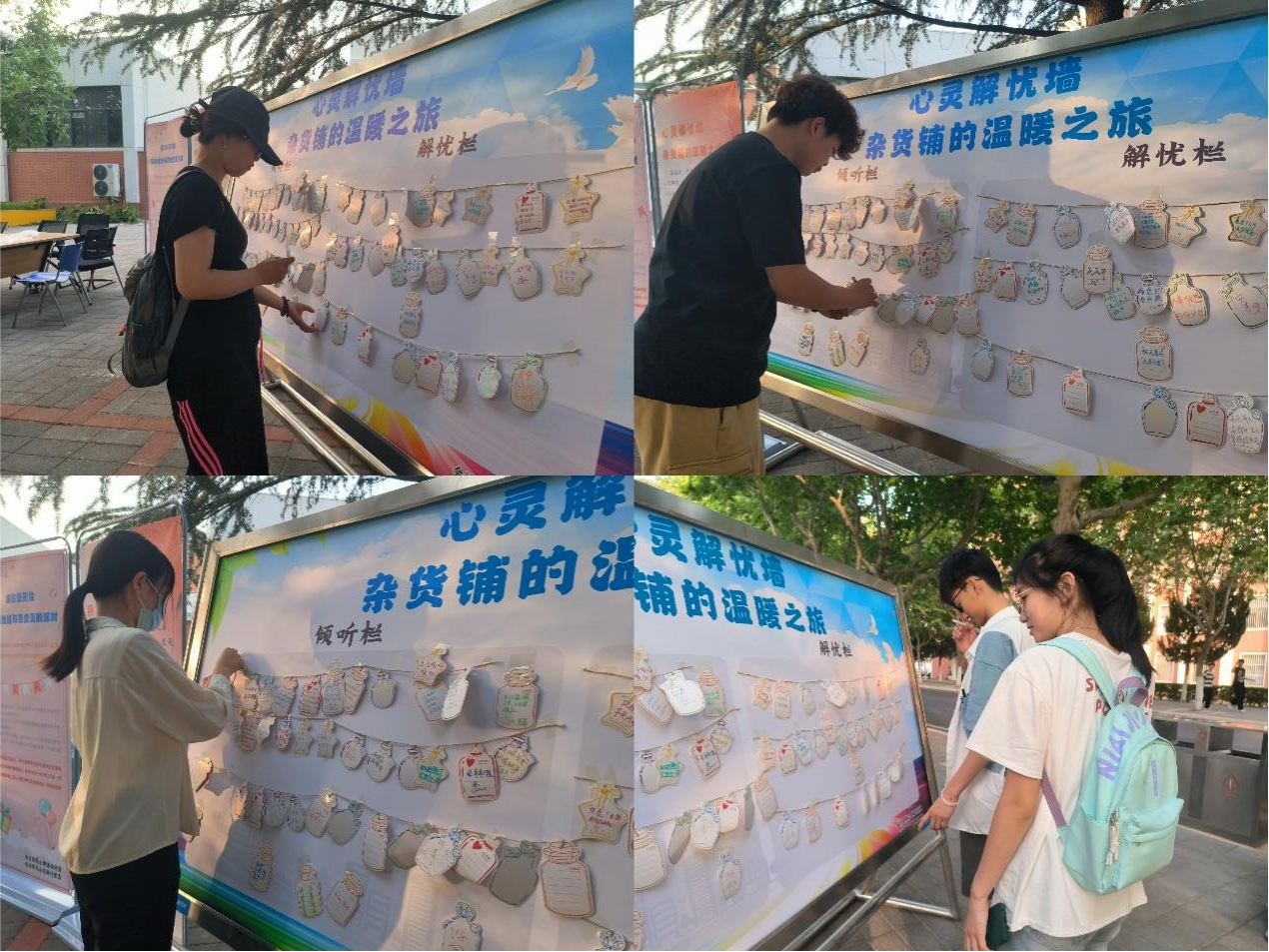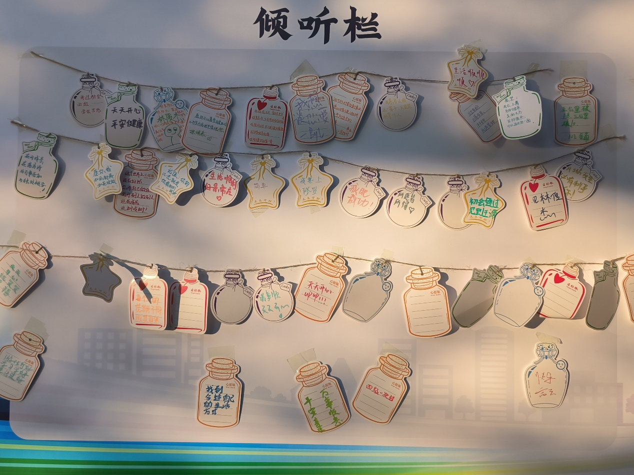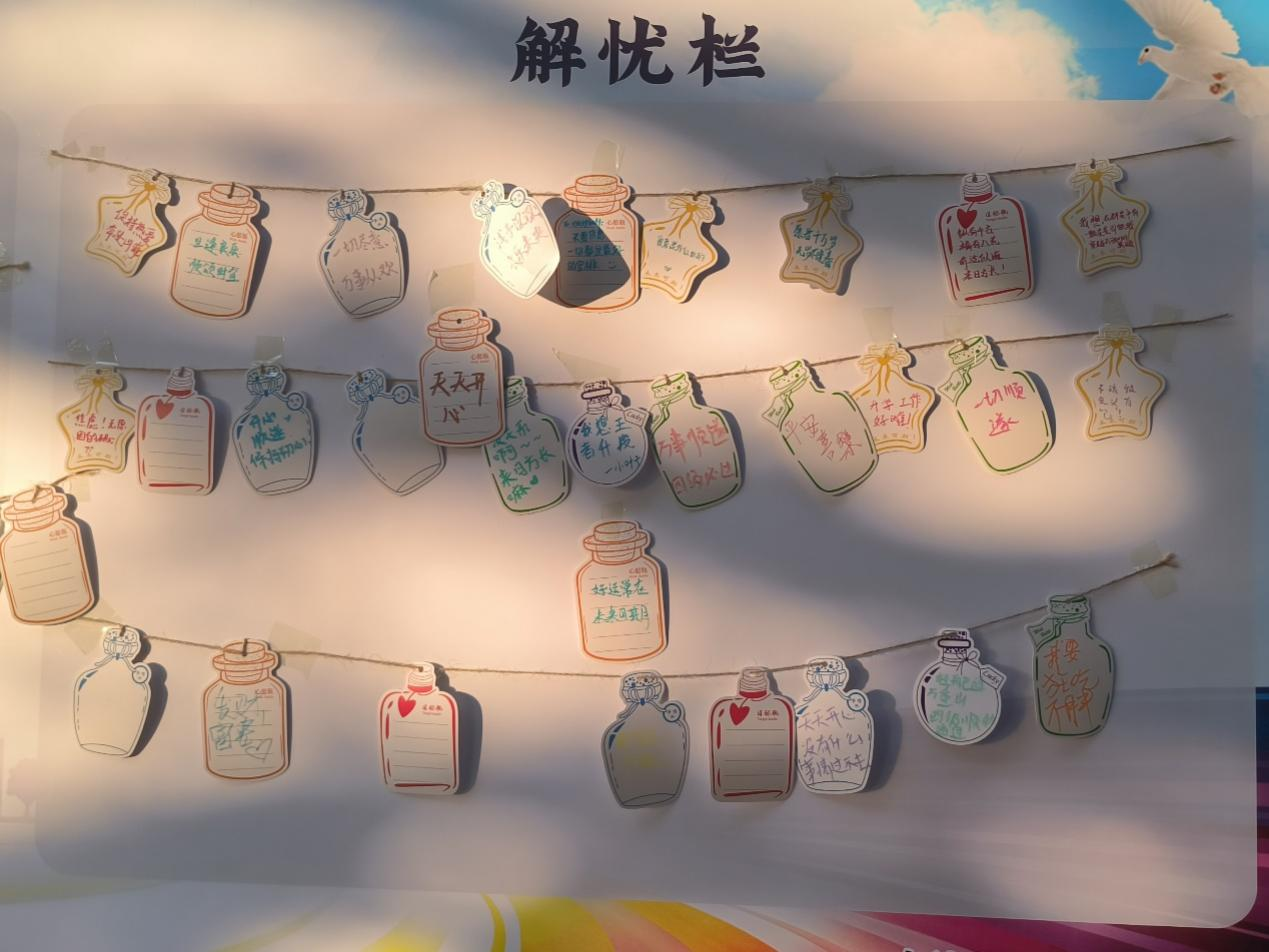本次活动准备了一张展板——心灵解忧墙,解忧墙上分有解忧栏和倾听栏。同学们通过在便签上写下自己的烦恼的方式来释放压力。此外,其他的参与者可以从“杂货铺”里抽取他人的纸条,以同理和关心的态度给予回应和建议。这种有趣的互动方式能够让每位学生在活动中找到慰藉,促进心理健康的全面提升,以更积极的心态面对生活。