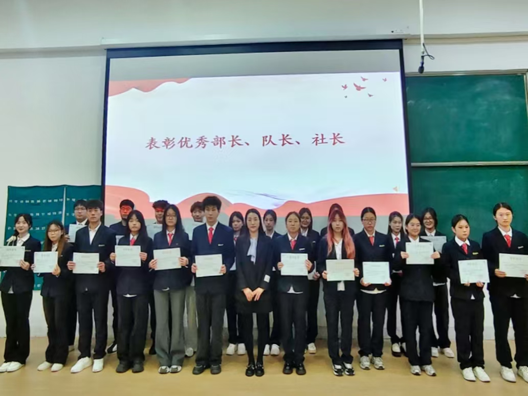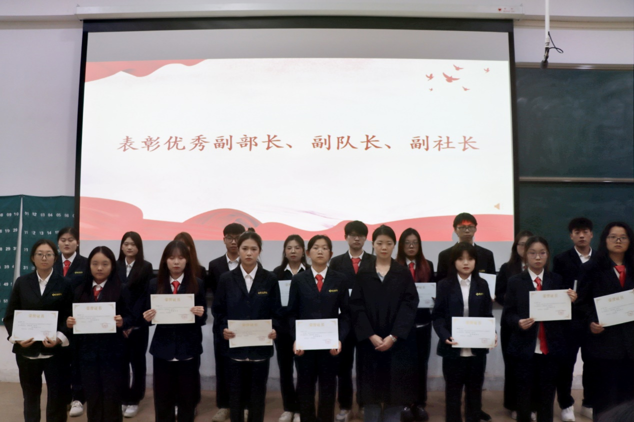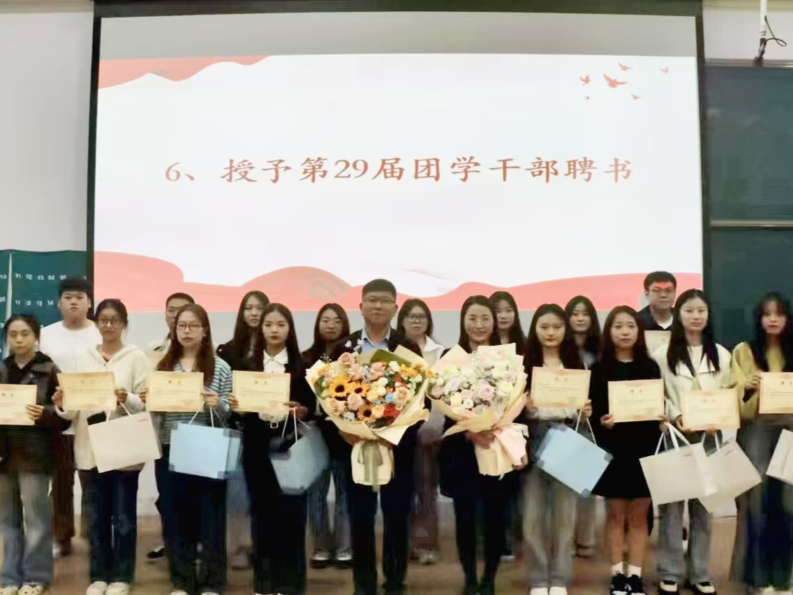 紧接着第29届团委副书记朱凯梦、学生会主席申含和社联理事长王赛迪依次进行工作总结。随后,大会进入了激动人心的颁奖环节。由陈刚老师、胡淑娟老师、董婉婉老师分别为本学年获得优秀部门、社团,优秀部长、队长、社长,优秀副部长、副社长、副队长的集体和个人颁发荣誉证书,并为第29届团学干部颁发了聘书和纪念品。