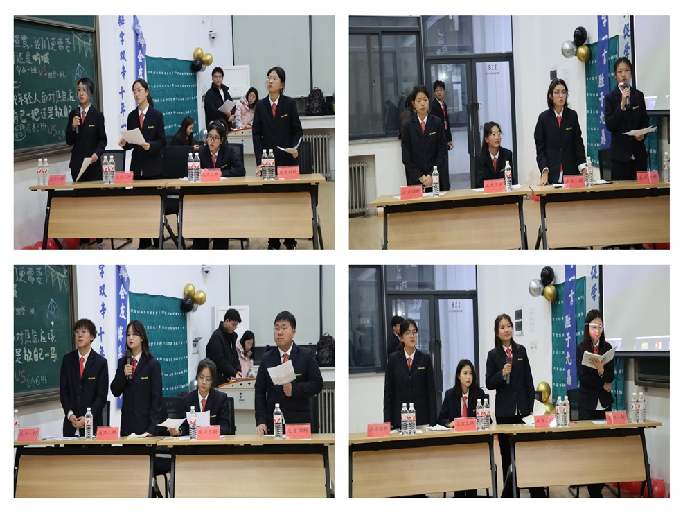 首先,由主持人介绍此次辩论赛的论题,接着在攻辩环节双方辩手言辞如剑,你来我往,互不相让。正方辩手逻辑严谨,阐述观点时条理清晰,力证己方立场;反方亦毫不逊色,思维敏捷,反驳时角度刁钻,不给对手丝毫喘息之机。激烈的辩论赛结束后,由第二十九届辩论队队长及副队长进行总结,并评价本次辩论赛的优点和不足之处。