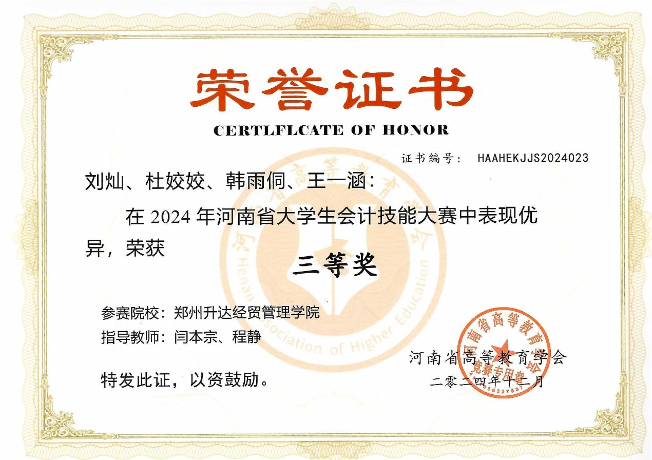 2024年11月17日,河南省大学生会计技能大赛在河南省高等教育学会的主办、许昌学院的承办以及厦门九九网智科技有限公司的技术支持下圆满落幕。在我校各级领导的大力支持下,经过多轮选拔和激烈竞争,太阳网集团tcy87222022级会计本科1班的刘灿、韩雨侗、王一涵和2023级会计专升本3班的杜姣姣四位同学组成的代表队,在闫本宗、程静两位老师的精心指导下,荣获大赛三等奖。