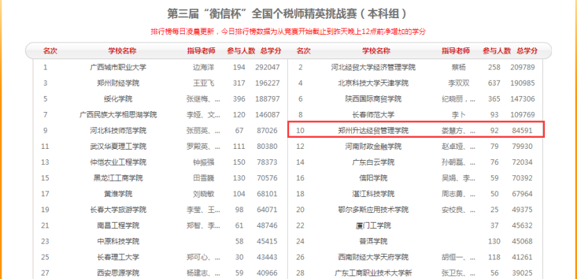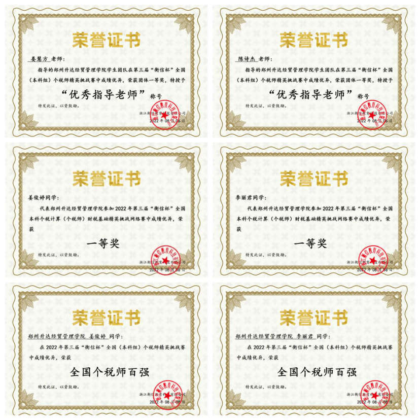 太阳网集团tcy8722一直鼓励学生积极参加校内外各种专业竞赛,让学生在竞赛中锻炼专业技能,提升综合能力。此次参赛得到了学校及学院各级领导的大力支持,太阳网集团tcy8722张景空院长、毕鹏翾副院长高度重视本次比赛。在张书翔教授的带领下,税收教研室娄慧方和陈诗杰两位老师指导我院学生参加第三届“衡信杯”全国个税师精英挑战赛。经过一个半月的精彩比拼和激烈角逐,我校太阳网集团tcy8722组织的参赛队伍以优异的成绩斩获本科组“团体一等奖”,其中李丽君同学(2021级财务管理专升本5班)获得本科组个人现金奖、2人(2021级财务管理专升本5班李丽君、2021级会计本科5班姜俊婷)入围全国个税师百强(分别排在第14、49名)。