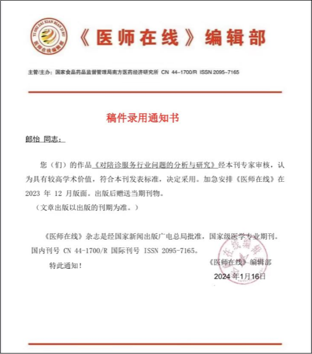 《医师在线》--《对陪诊服务行业问题的分析与研究》录稿