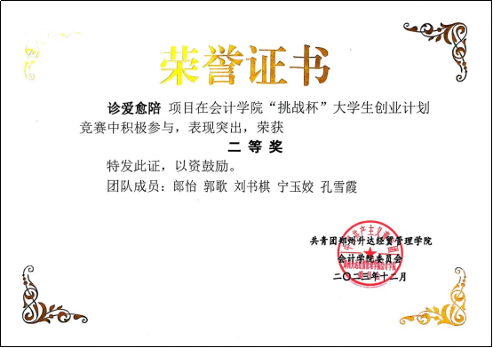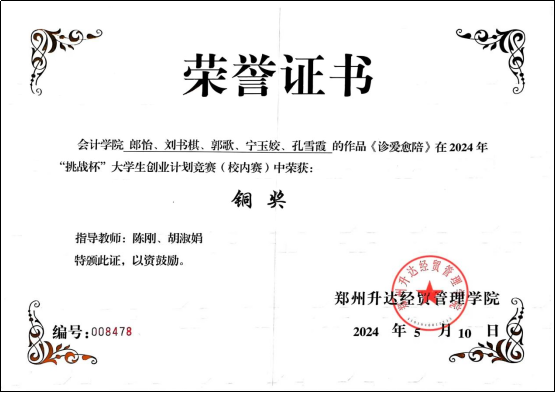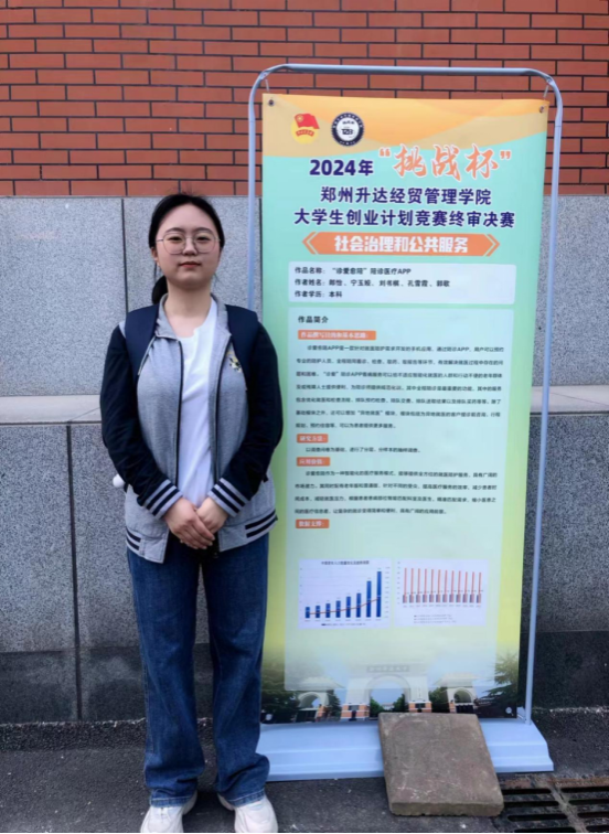 郎怡同学团队(刘书棋、孔雪霞、郭歌、宁玉姣),敏锐地洞察到了当前社会中老年人就医难、家属陪伴不便的社会痛点,创新性地提出了“诊爱愈陪”服务项目。该项目旨在通过专业、贴心的陪诊服务,为就医困难的老年人及需要特别关照的患者提供全方位的支持与帮助,缓解其就医过程中的孤独与无助感。他们深入调研市场需求,精心设计服务流程,不断优化用户体验,确保了项目的顺利实施与高效运营。该项目参加了河南省大学生创新创业训练计划。该团队以实际行动践行了社会责任,传递了关爱与温暖,展现了我校学生勇于担当、敢于创新的精神风貌。