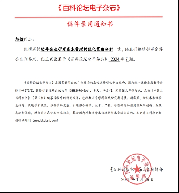 《百科论坛电子杂志》--《软件企业研发成本管理的优化策略分析》2024年7期录稿
