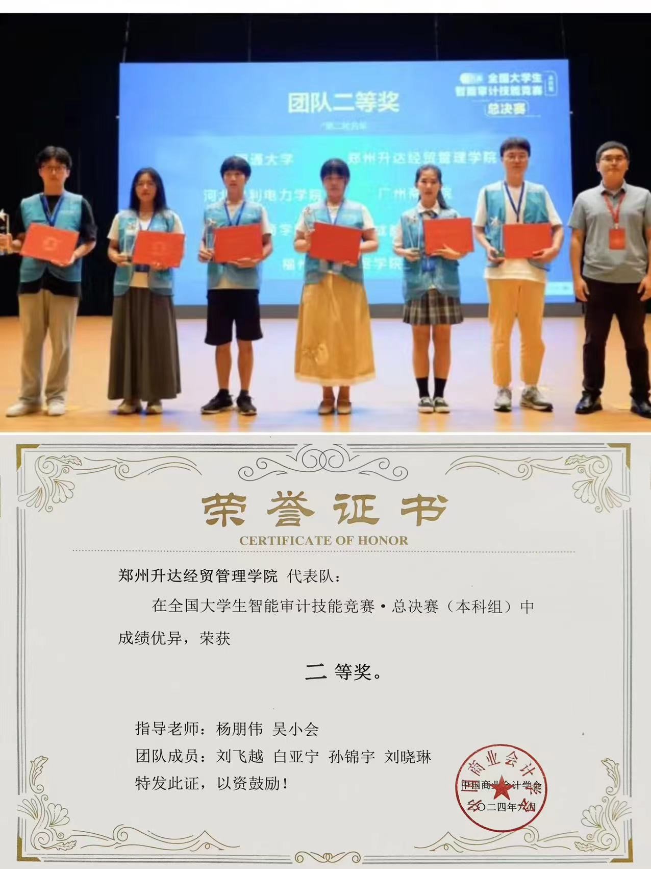 根据赛程设置及复赛成绩排名,我院最终推选2021级审计本科1班白亚宁、刘飞越和2021级审计本科2班孙锦宇、刘晓琳四位同学代表学校参加全国总决赛,比赛由杨朋伟和吴小会两位老师指导。总决赛竞赛内容分为两个环节,分别为审计职业素养竞赛环节和审计实务操作竞赛环节。其中,审计职业素养采用个人赛方式,审计实务操作采用团队赛方式,赛项整体设计团队赛与个人赛相结合,既有分工又有合作。经过激烈的比拼,我院队伍在全国40支队伍中脱颖而出,与内蒙古财经大学、湖南工商大学、南通大学等高校同获“全国总决赛团队二等奖”,充分展现出我院学子扎实的专业素养、实践能力和高度配合的团队精神。