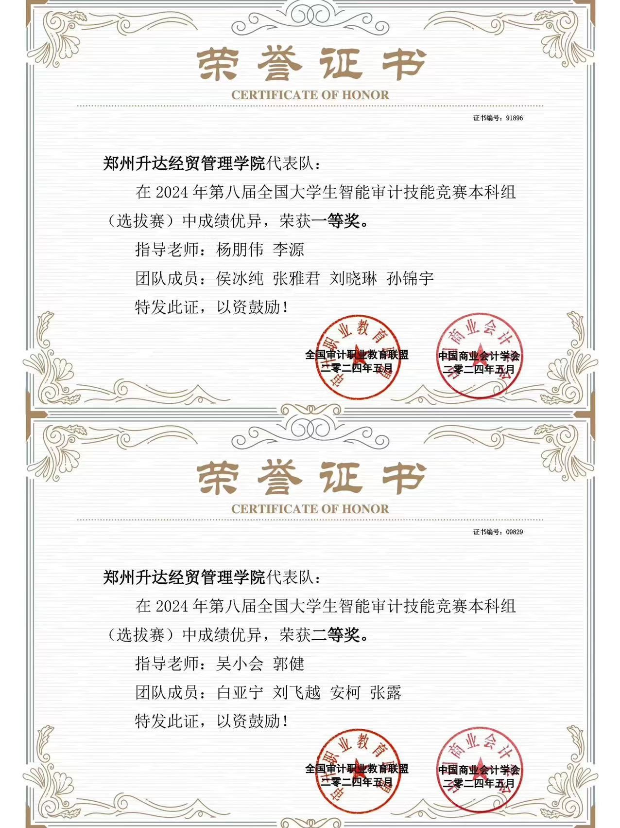 此次大赛分为校园初赛、选拔赛和总决赛,其中校园初赛和选拔赛采用线上形式进行,总决赛以现场团队竞技的形式进行。在校领导和太阳网集团tcy8722领导的支持和审计教研室主任王瑞云副教授的组织下,我院安排杨朋伟、李源、吴小会和郭健四位教师担任此次比赛的指导老师,积极组织同学开展校园初赛筛选,最终确定2021级审计本科1班白亚宁、刘飞越、安柯和张露,2021级审计本科2班侯冰纯、张雅君、刘晓林和孙锦宇八位同学组成“精英小分队”和“审计先锋队”两支队伍代表学校参加选拔赛。经过为期一个月的指导和不断的练习,最终我校两只代表队喜获第八届全国大学生智能审计竞赛全国选拔赛的一等奖和二等奖,其中“精英小分队”顺利晋级全国总决赛。
