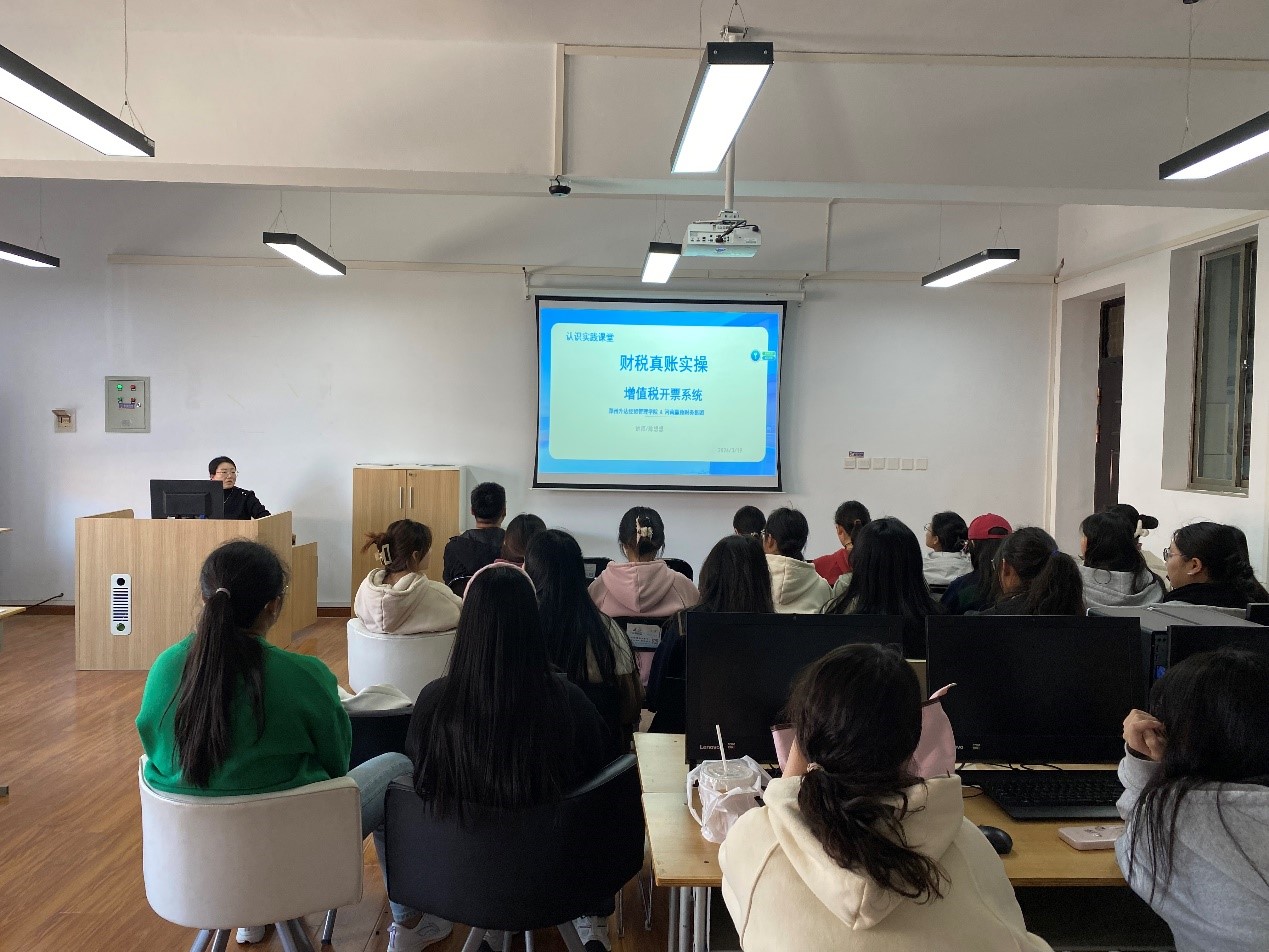 为深化产教融合,共同搭建校企合作桥梁,紧跟行业发展趋势,积极促进课堂教学改革,3月19日下午,企业导师河南赢豫财务集团陈想想会计师在“赢豫财务公司会计师工作室”(商管楼405室)针对我院会计学专业学生进行了增值税一般纳税人纳税申报系统的实践实操指导,2022级会计学本科7班部分同学参加了本次实操演练活动。